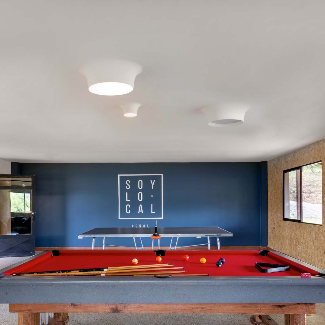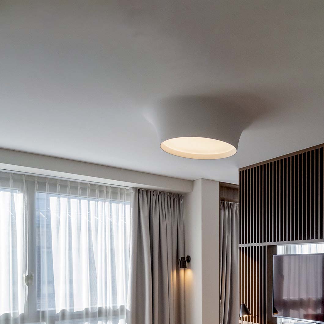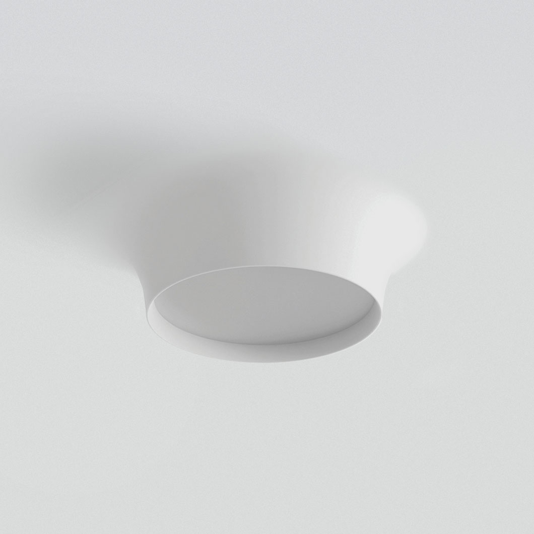The contemporary Bolla 8935B by 9010 Novantadieci is recessed into the ceiling and then plastered in, creating a light that curves smoothly outwards from the architecture. Offering a soft round ambient glow radiating through the Ø400mm glass diffuser, the Bolla ceiling light has an organic and minimal conical shape.