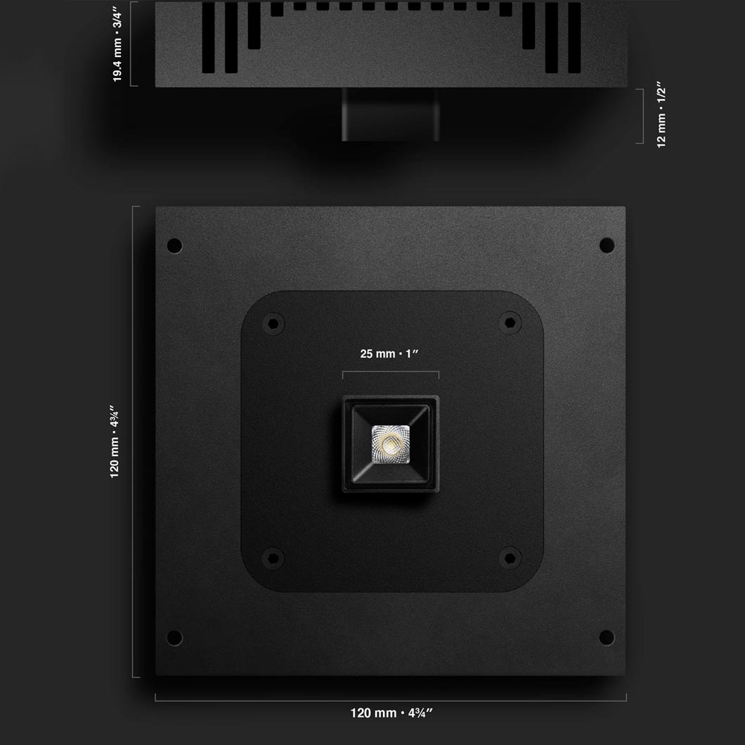 The high-tech design features a 25 x 25mm aperture that distributes glare-free 'invisible' light in either a 20 or 40 degree beam spread. Minus 2 produces a massive 1000 lumens from source. Compatible with various dimming protocols, each fully compatible with all major architectural lighting control systems.