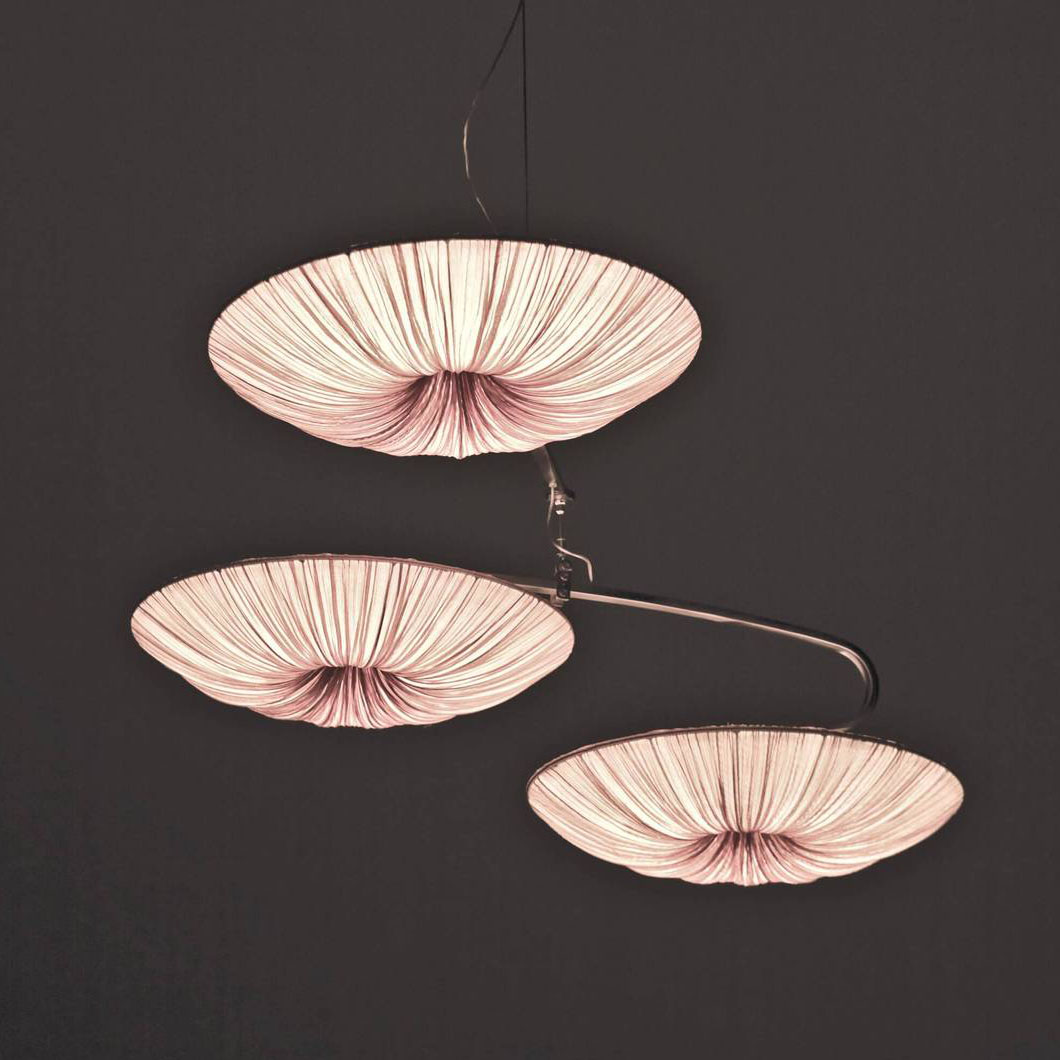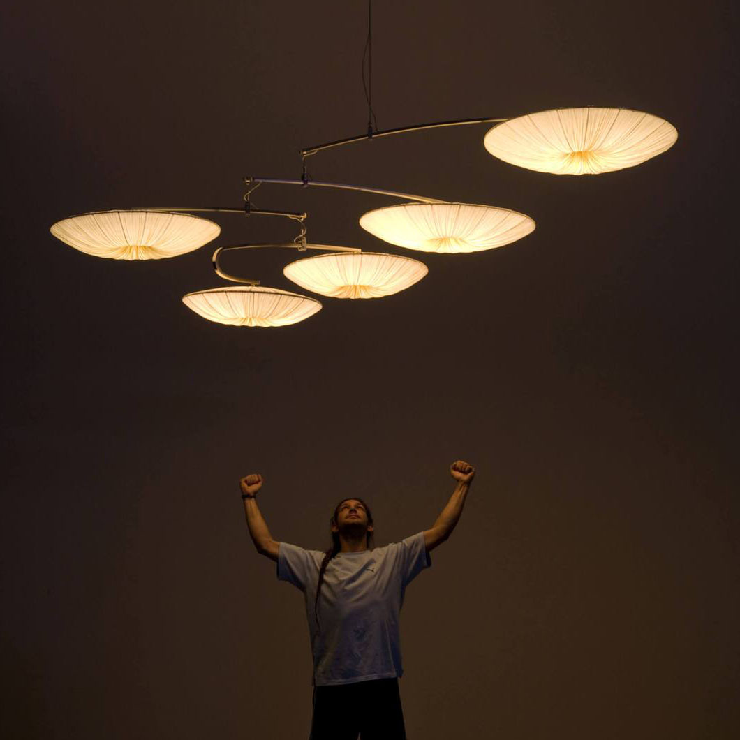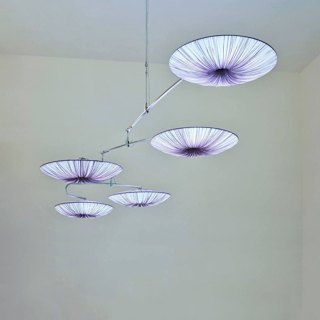 Appearing as sleek rings which float weightlessly from the ceiling, Stand By Mobile is an intriguing cluster of pendants whose distinctive design succeeds in becoming the main decorative focus of any interior space. The Stand By collection is distinct in their circular form, geometric line design and ability to project a bright LED glow across an interior space.Boasting a eye-catching & elegant design, Stand By amazes with its circular structures and handcrafted silk body.