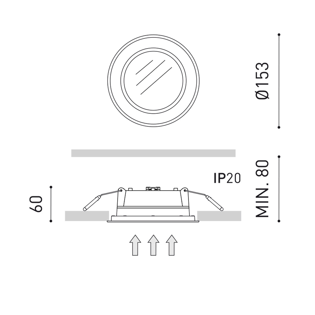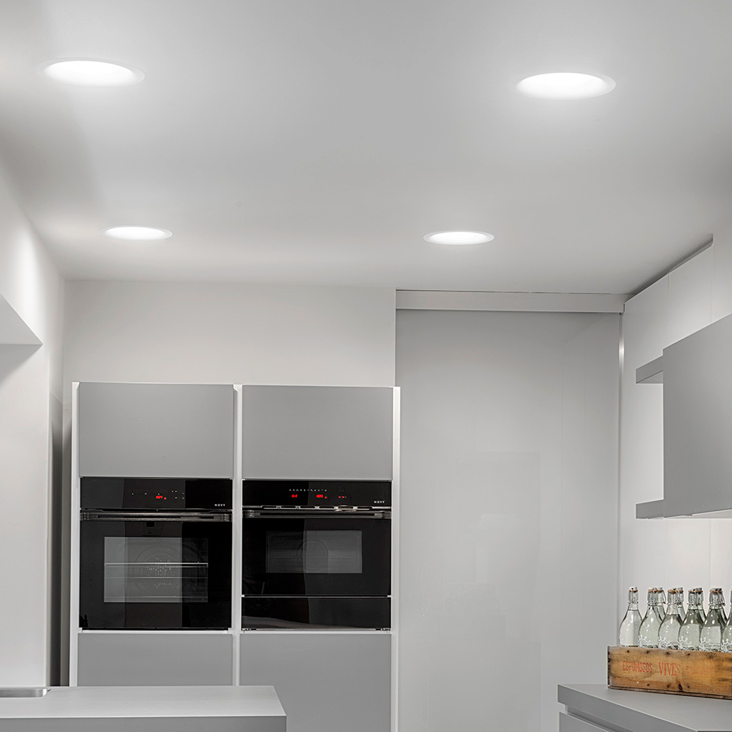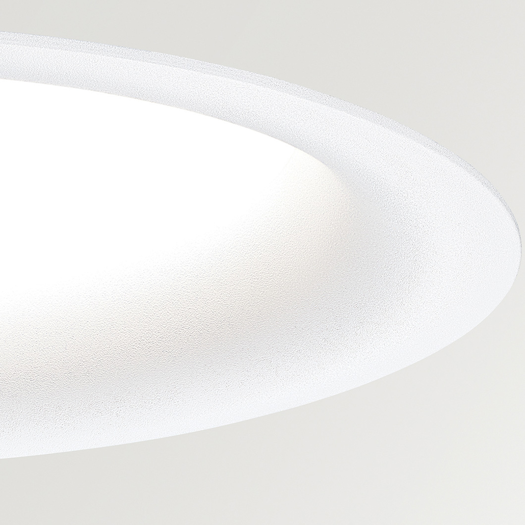 The recessed fitting has a diameter of 153mm and a total height of 60mm. Choose between three colour temperatures: 2700K, 3000K, or 4000K. Drop Mini is powered by an integrated LED with either 7W or 10W power. The minimalist luminaire can be made with IP43 or IP54 rated protection. Available in non-dimming, DALI, or PUSH variations. Driver included.