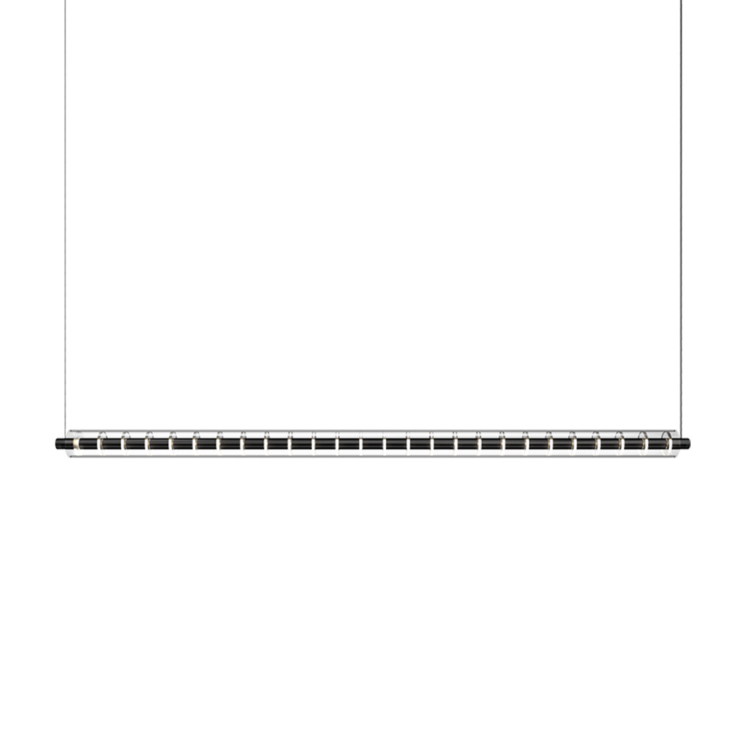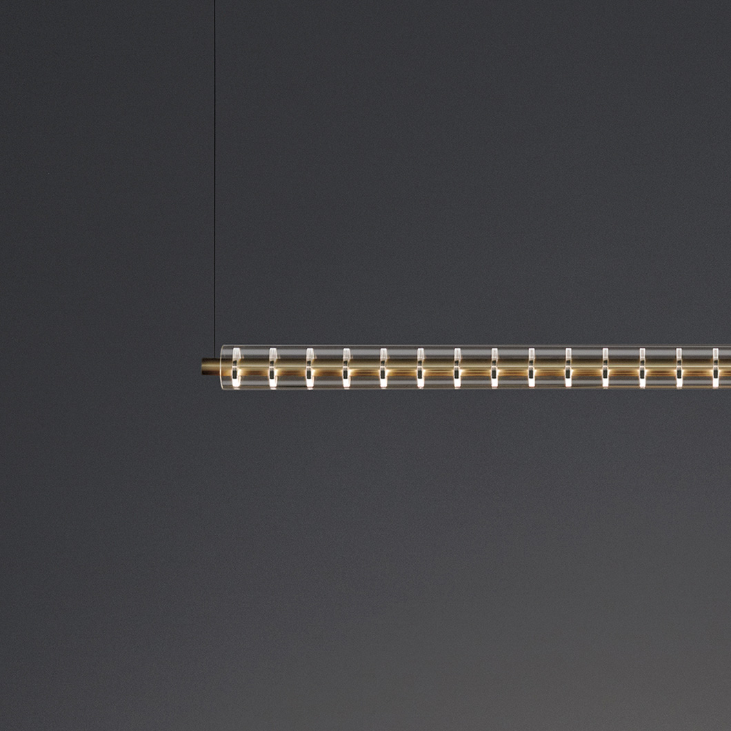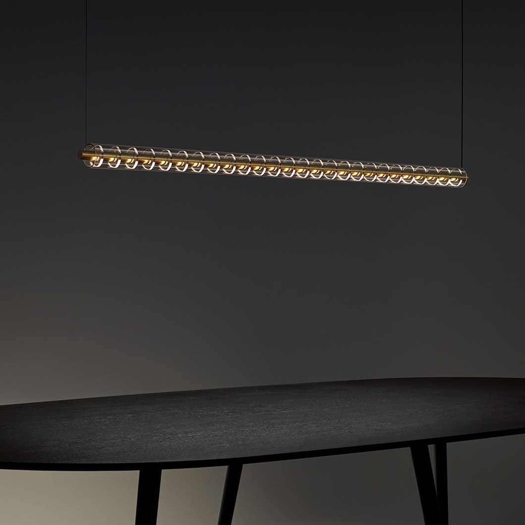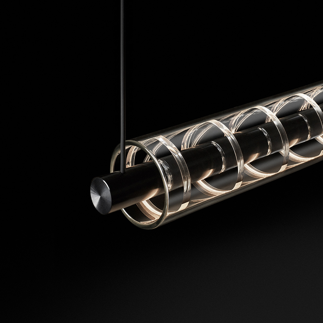 The Loop Pendant by Arkoslight showcases industrial inspirations with a design reminiscent of electrical insulators. Its cylindrical, clear glass body carries a metallic rod through its interior with a series of light disks emitting a soft, ambient glow. An integrated LED powers the modern suspension light's elongated linear structure.