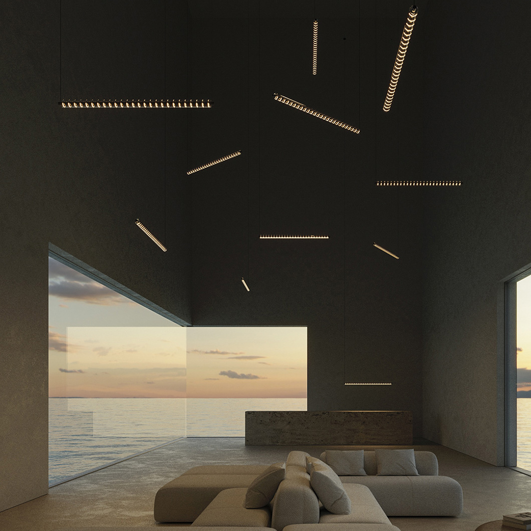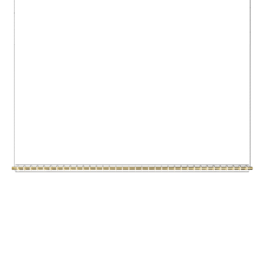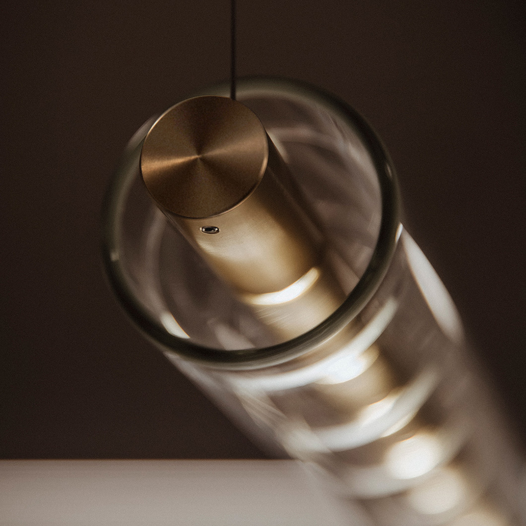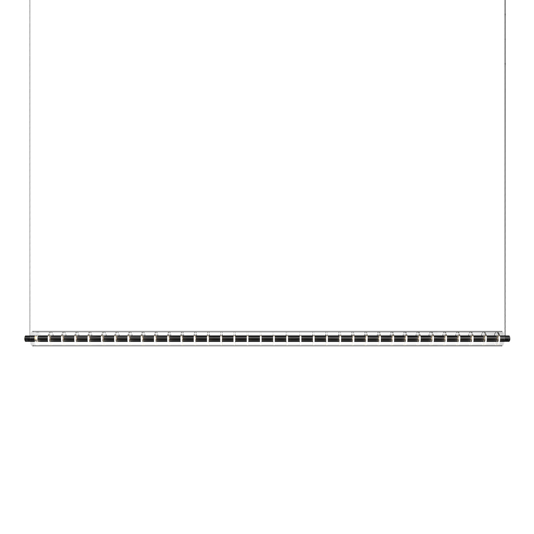 The Loop Pendant by Arkoslight showcases industrial inspirations with a design reminiscent of electrical insulators. Its cylindrical, clear glass body carries a metallic rod through its interior with a series of light disks emitting a soft, ambient glow. An integrated LED powers the modern suspension light's elongated linear structure.