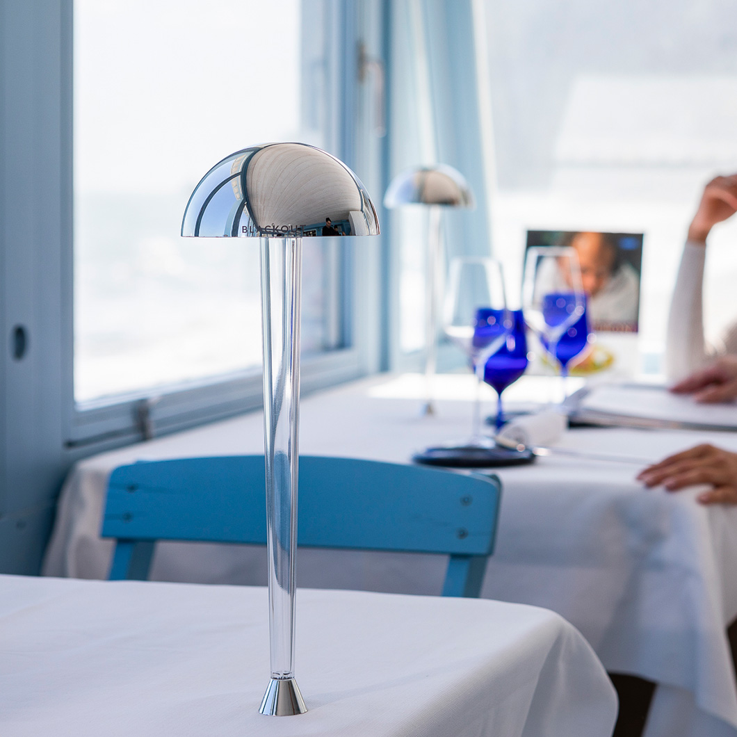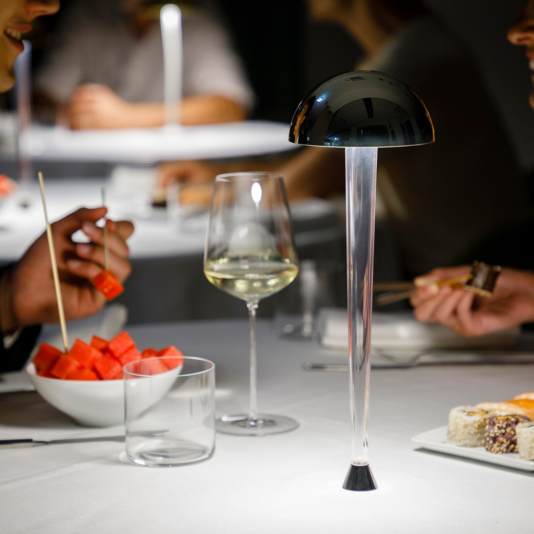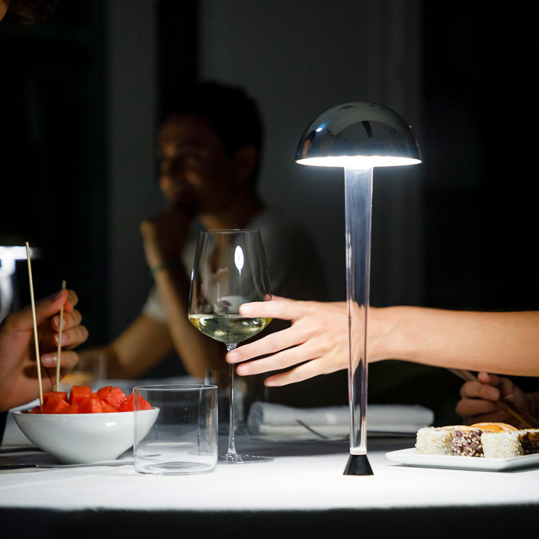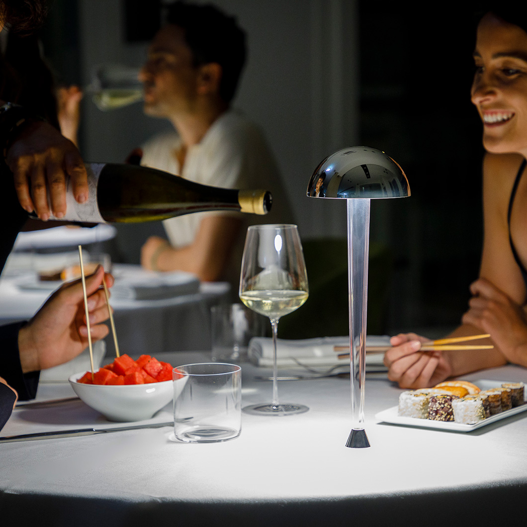Fixed on a long, transparent stem, the metallic shade gives the illusion of a floating UFO, hovering a warm light around the desired setting. Supplied with a magnetic disc, the lamp can easily be anchored onto a table, concealing the base to enhance the magical levitation. With its wireless abilities, PIN UP can be transported anywhere, bringing its elegant aura with it.