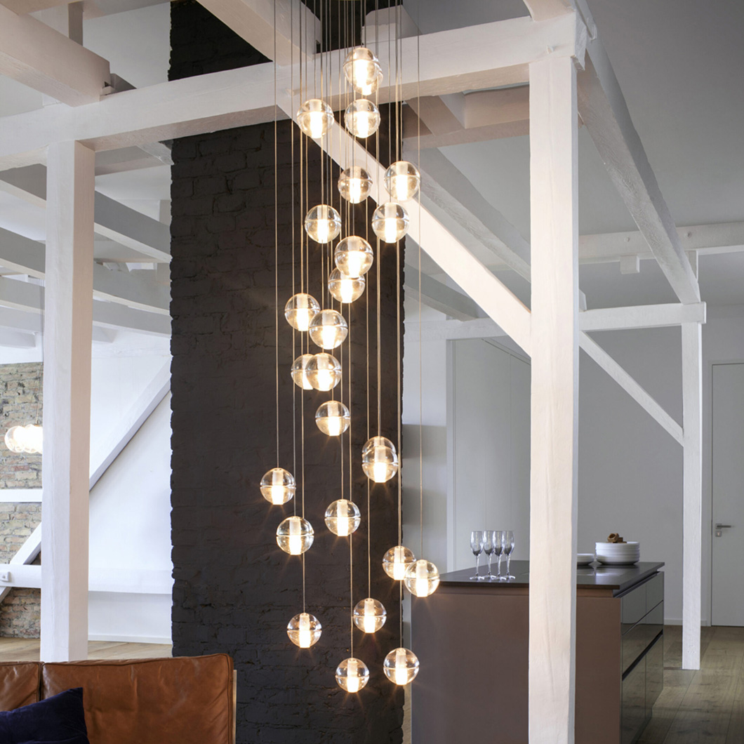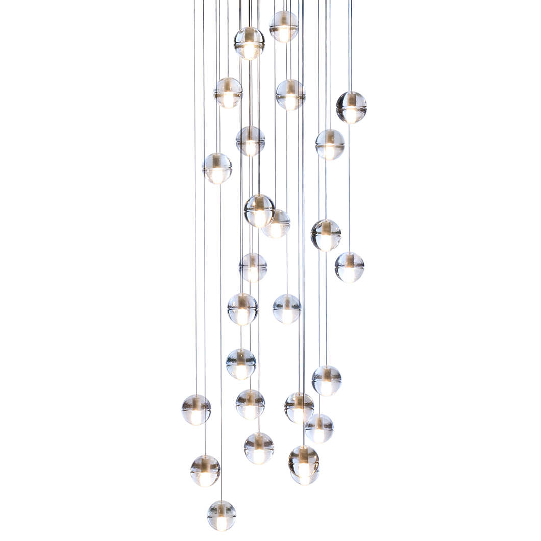 This is a low voltage chandelier; each individual pendant is an articulated cast glass sphere with a frosted cylindrical void that houses either a 10 watt xenon or 1W LED lamp. Choose from clear, grey, or sepia glass colours.