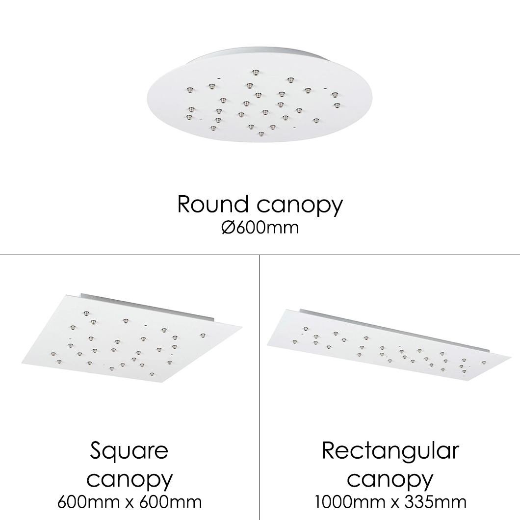 The 14.26 uses headphone jack connections, which allow the pendants to be “plugged in” to the canopy for ease and speed of installation. The pendant lengths are pre-set during production and are not site adjustable.