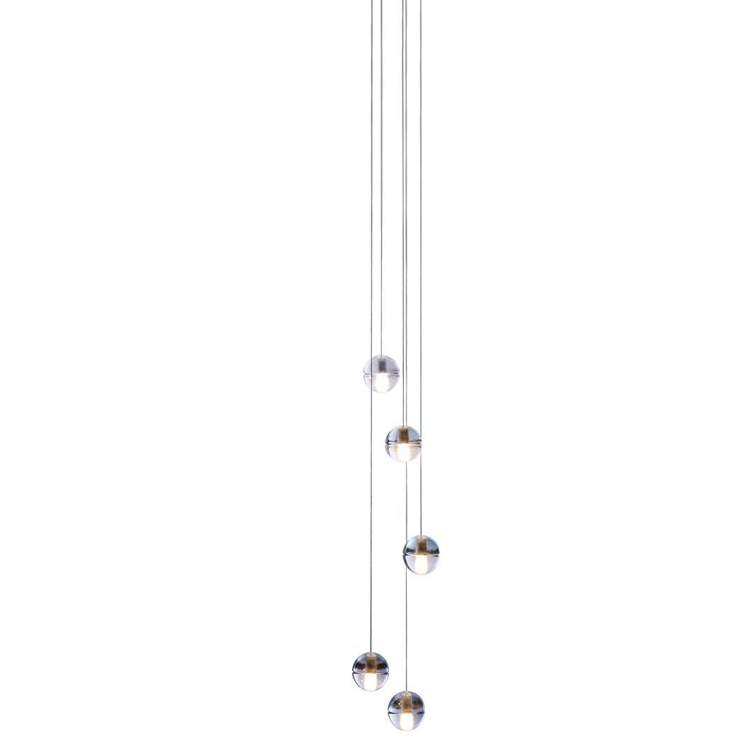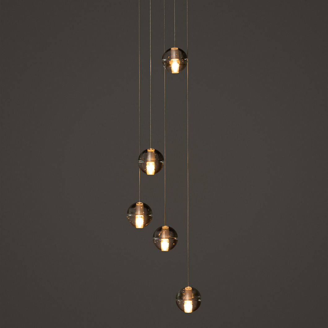 This is a low voltage chandelier; each individual pendant is an articulated cast glass sphere with a frosted cylindrical void that houses either a 10 watt xenon or 1 watt LED lamp. Select between clear, grey, or sepia glass colours.