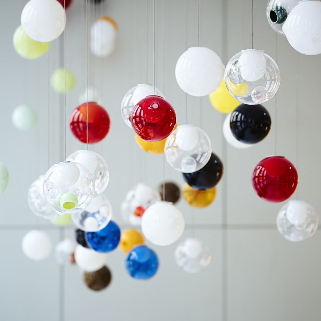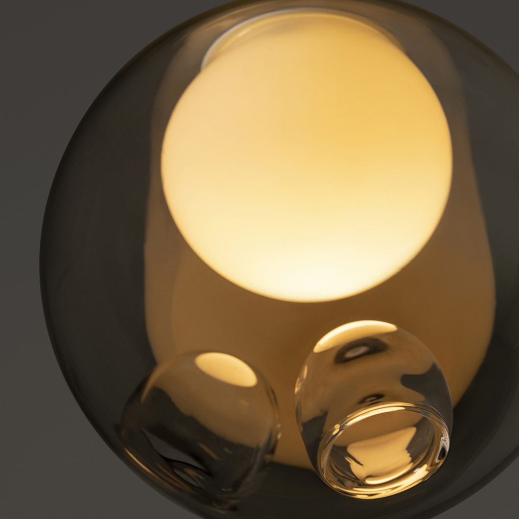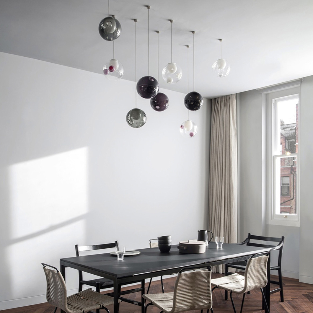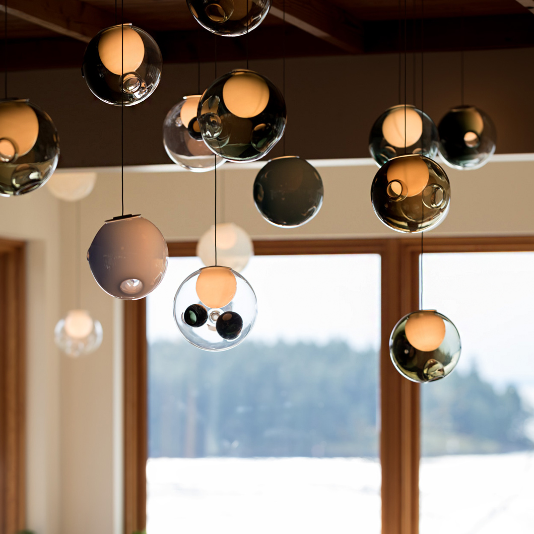 The glass spheres are available in clear, light-toned, and bright-toned colours. The 28.1 is the single-drop pendant variation of this series, suitable for dropping above a coffee table or in a hallway. Cluster variations are also available.