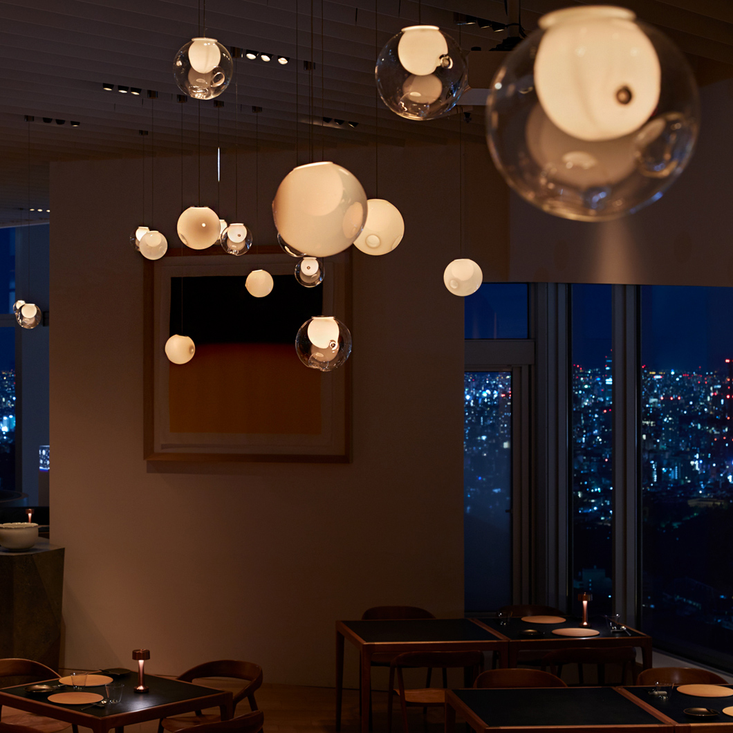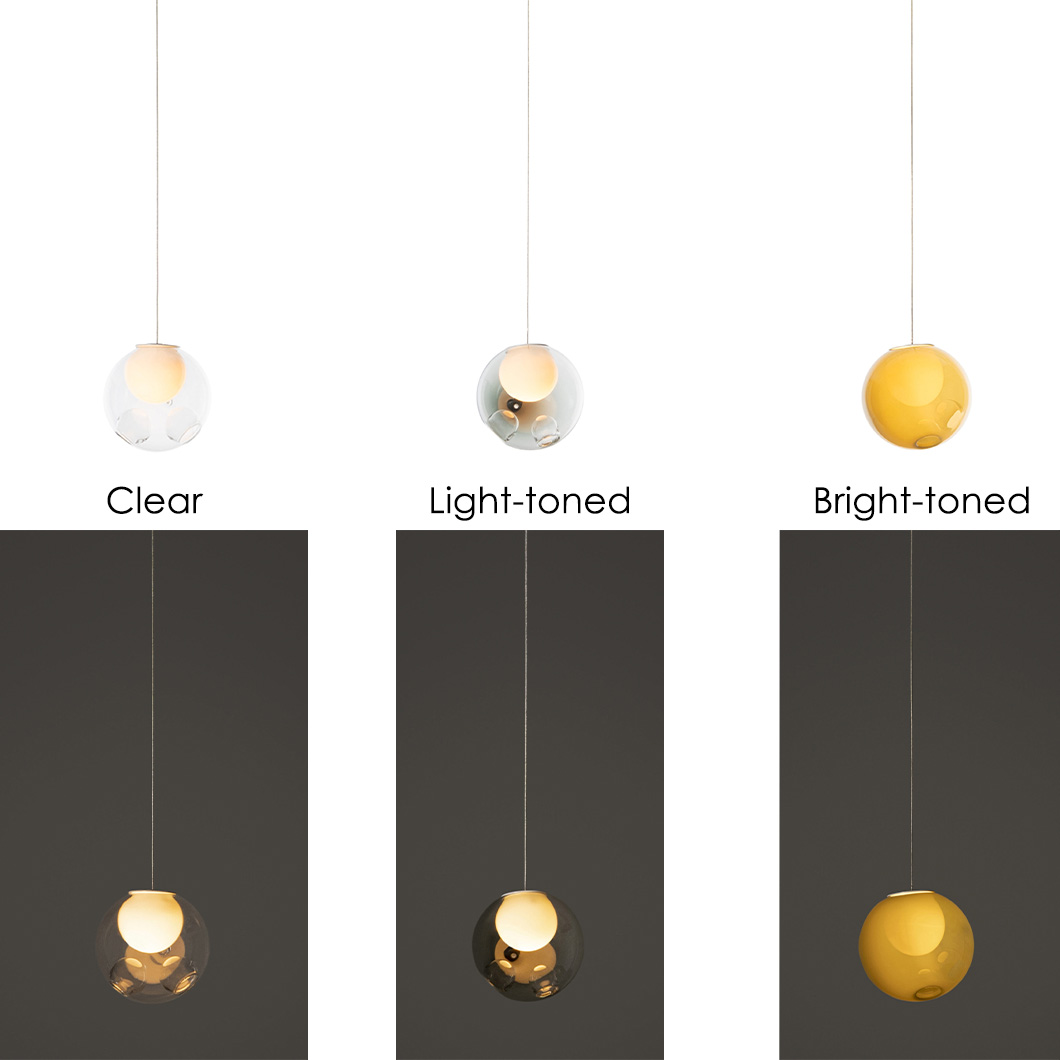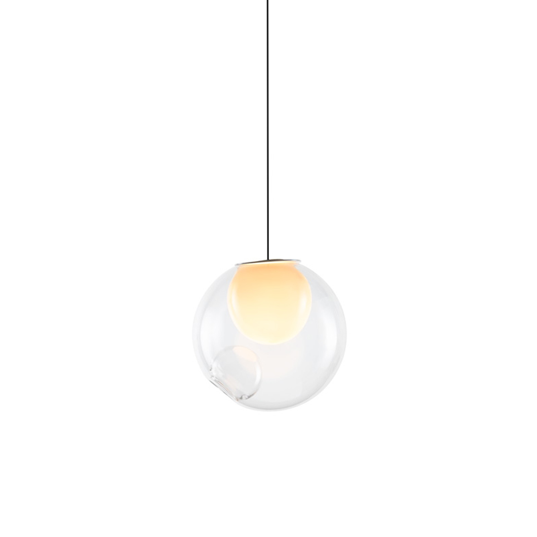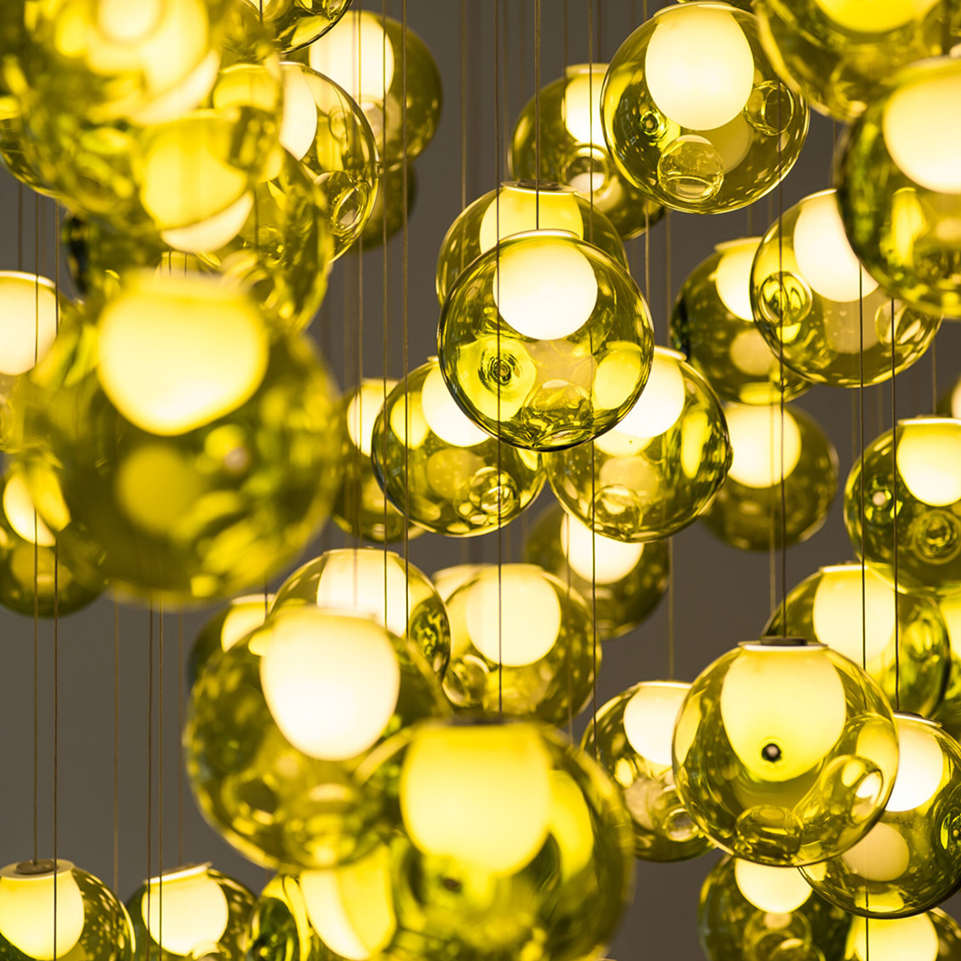 The glass spheres are available in clear, light-toned, and bright-toned colours. The 28.1 is the single-drop pendant variation of this series, suitable for dropping above a coffee table or in a hallway. Cluster variations are also available.
