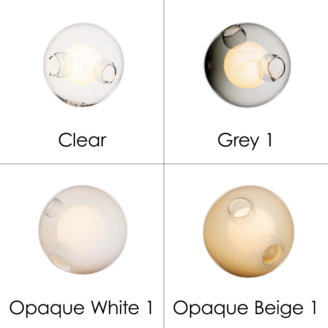 The glass sphere is available in clear as standard, also offering grey, beige, and white finish options. Other finishes are available on request, please contact us for more information. The 28.1 is the single-drop pendant variation of this series, suitable for dropping above a coffee table or in a hallway. Cluster variations are also available.