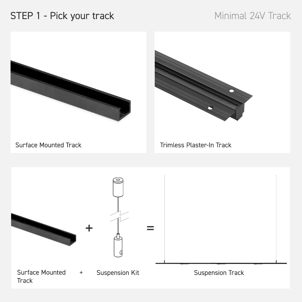 If you're not sure where to start on building a bespoke track system, take a look at our preset surface-mounted, trimless plaster-in, and suspension track package listings.
