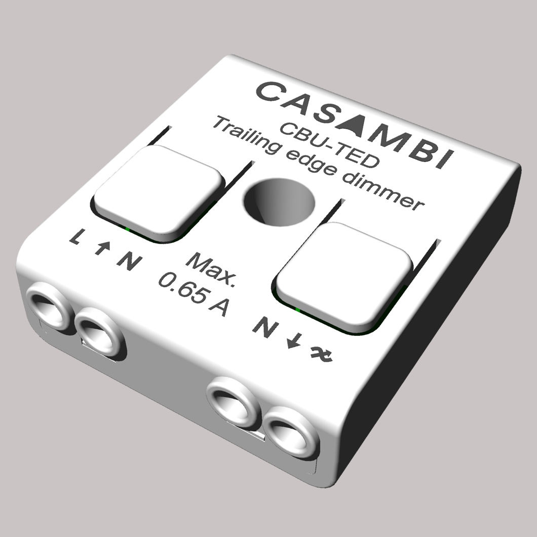 The Casambi CBU-TED is a wireless dimming control unit for trailing edge phase cut / mains dimming LED or halogen luminaires. The control unit uses BLE (Bluetooth Low Energy) technology which means no external gateway device is required – being more cost effective and is also considered as more reliable than WIFI based dimming units through its ‘mesh network’.