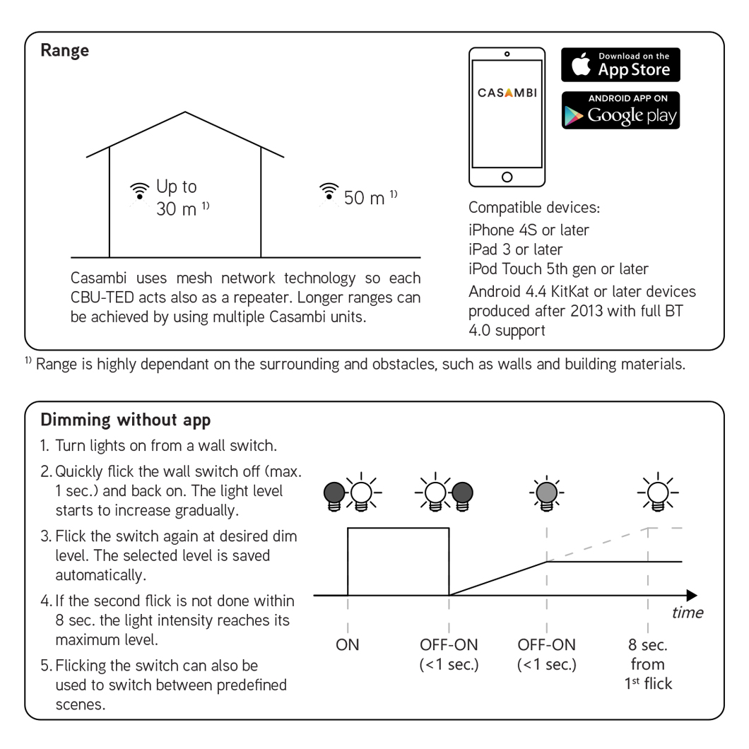 Download the free Casambi app on your smartphone/tablet to control your lights or alternatively, you can use an existing standard wall switch or Casambi’s own advanced X-Press switch (see related products below).