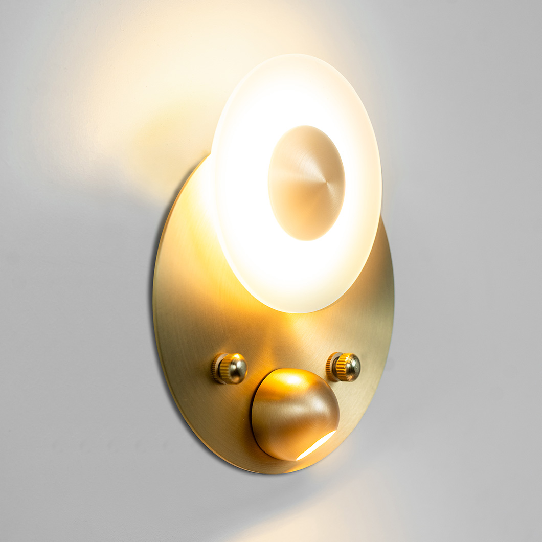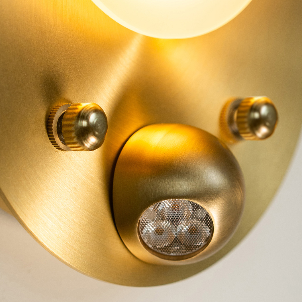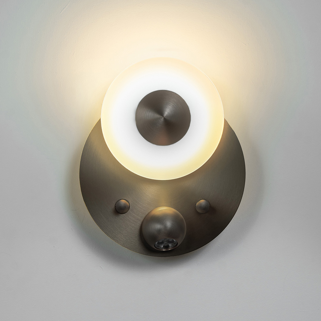 Choose between four stylish satin finishes: brass, copper, nickel, or graphite. Polished versions of these finishes are available on request - contact us for more details. Finish 1 refers to the smaller, upper disc and the spotlight element, and finish 2 refers to the large, base disc. Choose the same finish for a more minimalist look, or opt for two different swatches to enhance the decorative nature of the piece. Watch the short video below to learn how to correctly install the wall light.