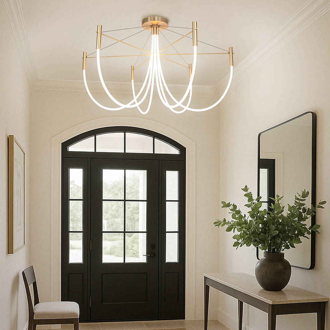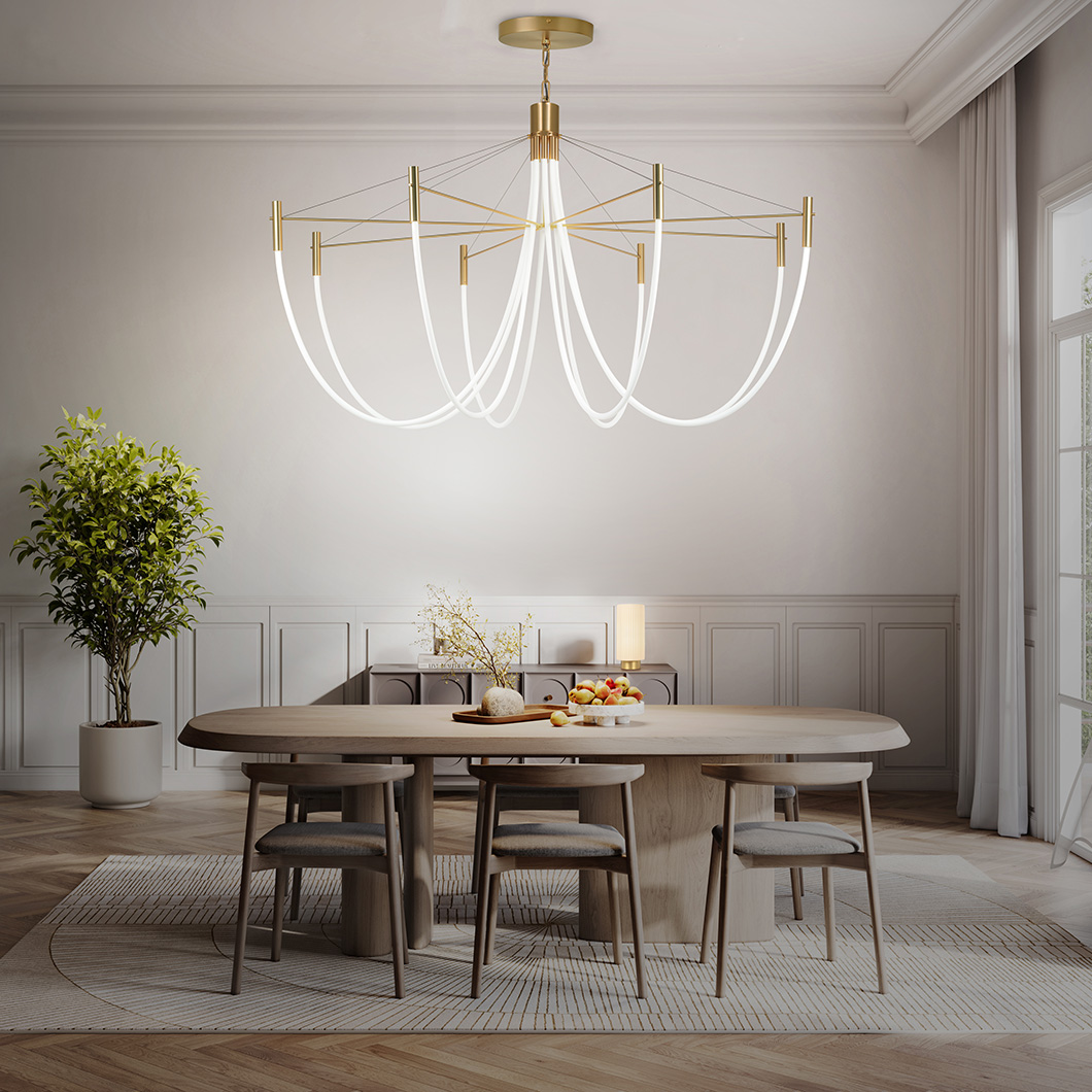 The statement chandelier is available in four metallic finishes: brass, copper, graphite, or nickel. Each finish offers a distinctive look to match a range of interiors. Paradoxe comes in three different models, offering 5, 6, or 8 illuminated arms. Each variant also offers a fixed stem version or a longer chain version, depending on the size of your space. Paradoxe is supplied with an integrated LED that diffuses a soft 2700K glow. This chandelier is phase-cut dimmable.