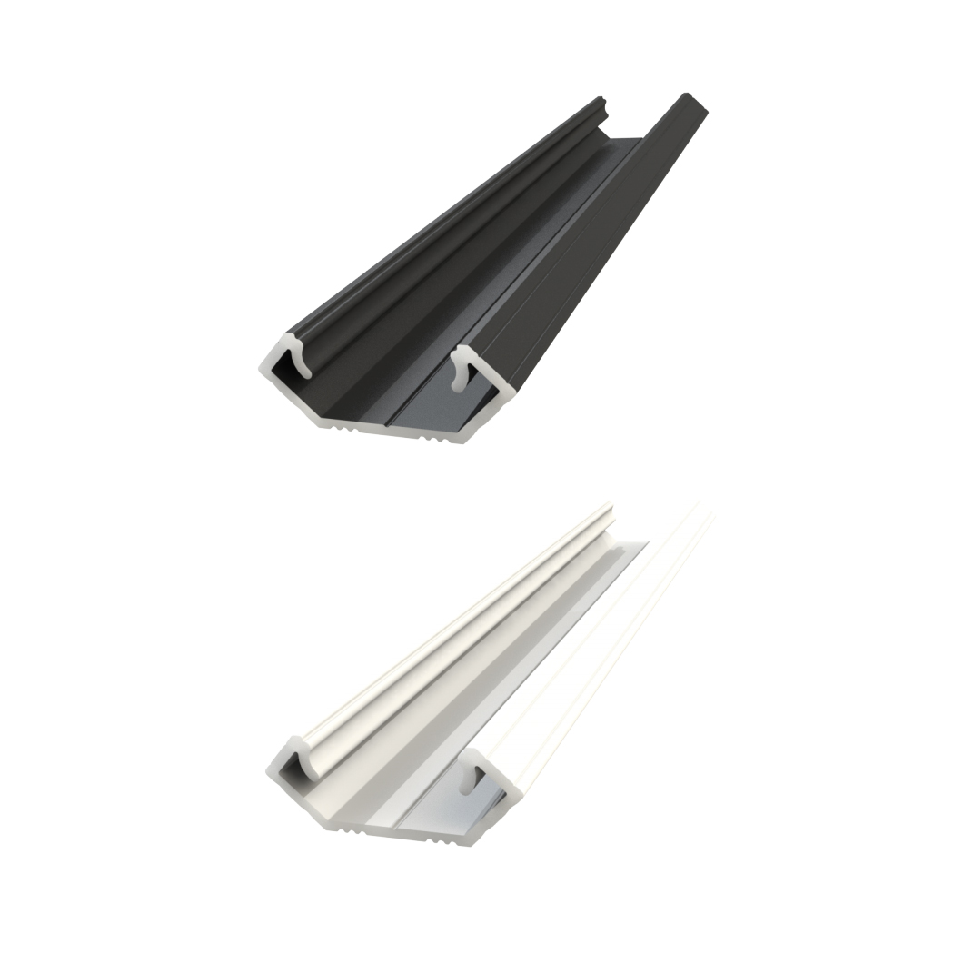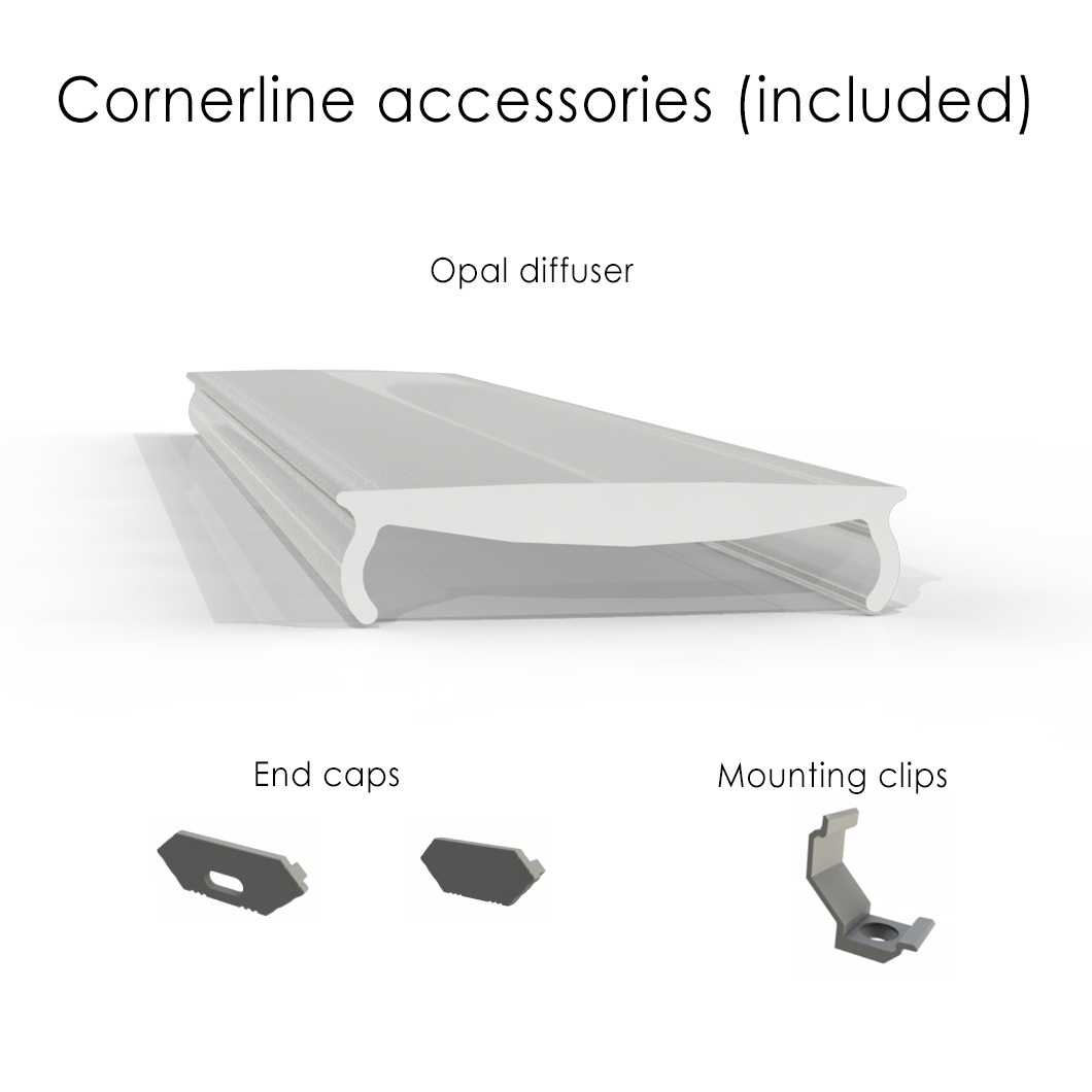 Cornerline anodized aluminium profile extrusion is suitable for surface corner mounting. The profile can take self-adhesive linear LED tape up to 12mm wide. Aluminium acts as a heat sink which prolongs the life and colour consistency of the LEDs in the strip, making it the perfect material. Each length comes complete with a diffuser, set of end caps and mounting clips. Diffuser in opal.