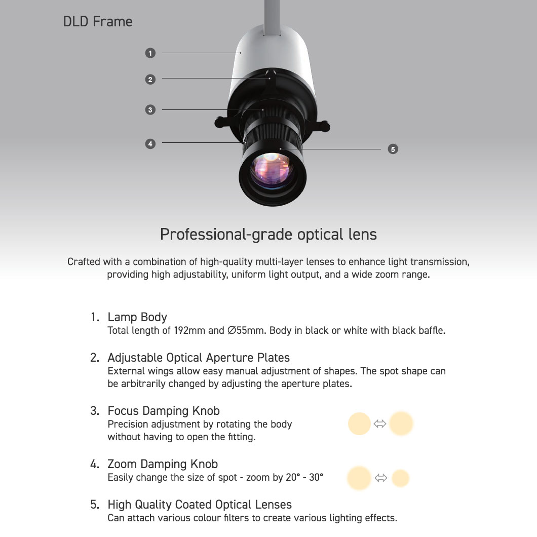 Designed for lighting artwork, the DLD Frame surface mounted spot is perfect for museums, galleries or for the home. With an adjustable tilt of 90° and rotation of 355°, the DLD Frame also boasts a 20° - 35° beam angle for narrow or medium projections. Baffle and lens unit in black, whilst the body and housing is available in black or white. Choose from warm white 2700K or cooler white 3000K colour temperatures depending on usage.