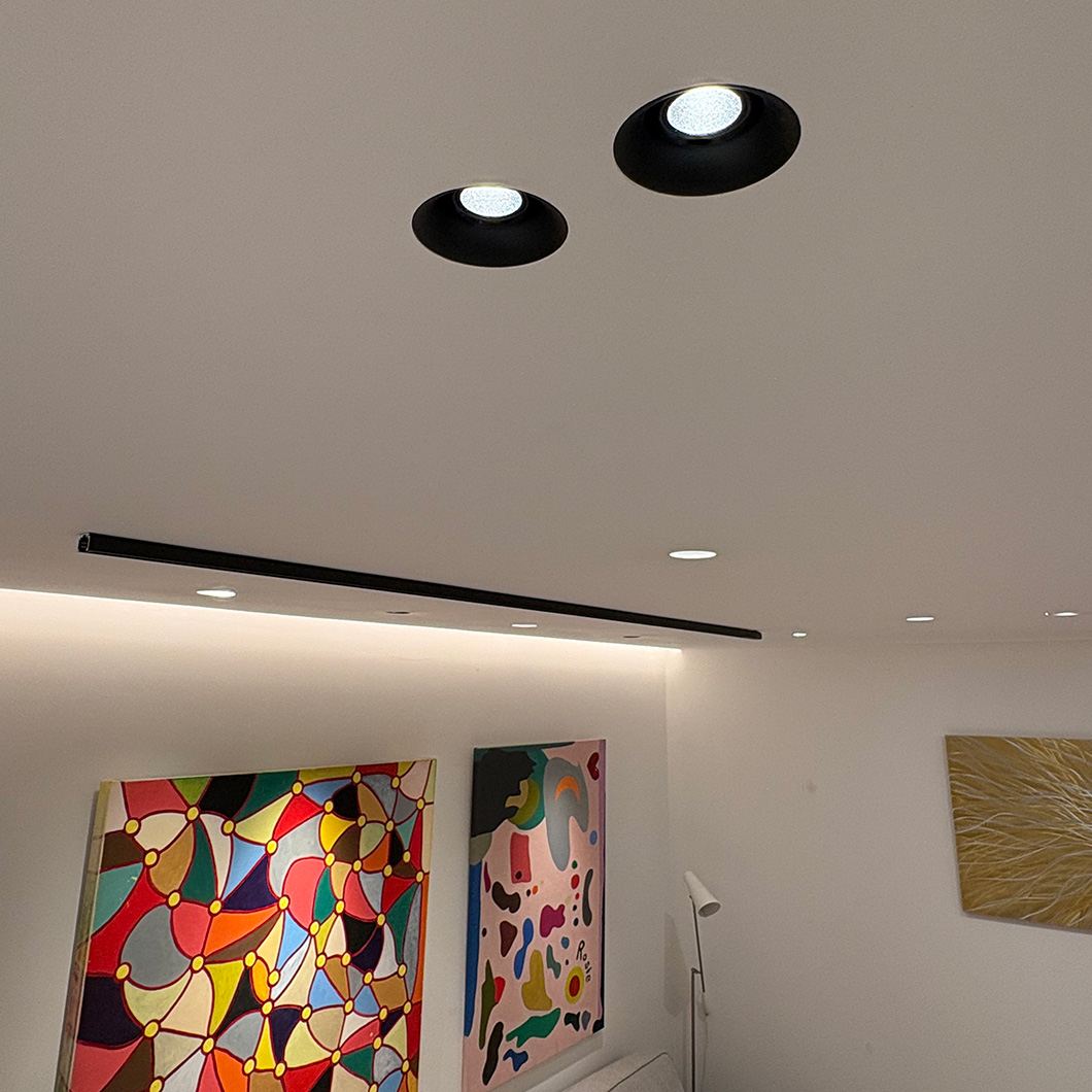 The plaster-in frame is fixed directly into the ceiling before being plastered and decorated for a seamless finish. The LED light engine is easy to pop in and out of the frame, making post-installation maintenance simple. Nebo is available in white or black finishes, with white or black inner baffle options. 2700K or 3000K colour temperatures. An optional fire ring accessory is available to make the fitting fire-rated. Dimmable with either 0-10V, TRIAC or DALI dimming drivers - see the dropdown or the specification tab for options.