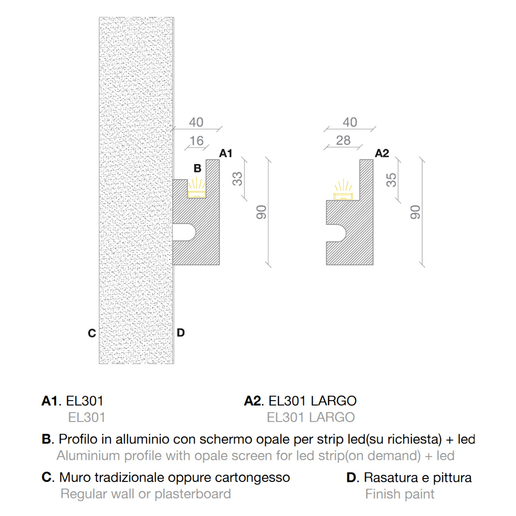 The Eleni EL301 linear profile cornice provides indirect cove lighting. Perfect for creating a modern and understated ambient lighting effect, EL301 can be installed on the wall, into the ceiling or used as an uplighting skirting board or a hand rail on a staircase. This variation is for recessed mounting as opposed the surface mounted Largo counterpart (see below for info). Suitable for LED strip up to 16mm in width.