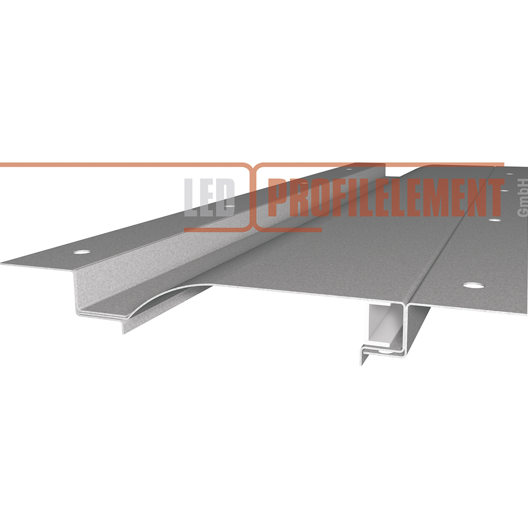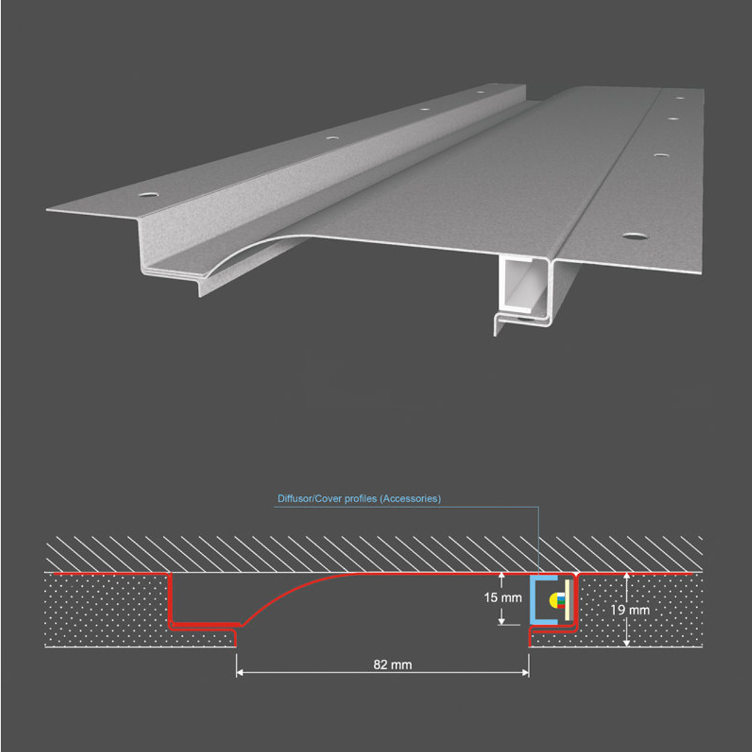 LED Profilelement R10-F plaster-in profile with reflector wing for installation in the surface with or without substructure - not suitable for drywalls. Suitable for wall or ceiling installation, R10-F integrates invisibly with the surrounding architecture, and is the perfect choice for cove lighting and for creating dramatic indirect lighting effects. The curved reflector creates a calm flow of light. Suitable for use with LED tape up to 15mm in width. With peel bar for flush plastering, minimum plaster thickness 19mm. Shadow casting can be avoided by altering the plane that the LED strip is fixed to. Made of zinc, which acts as a heat sink for the LED strip, the R10-F profile is supplied with the primer already applied. Diffuser available for a softened, refracted lighting effect.