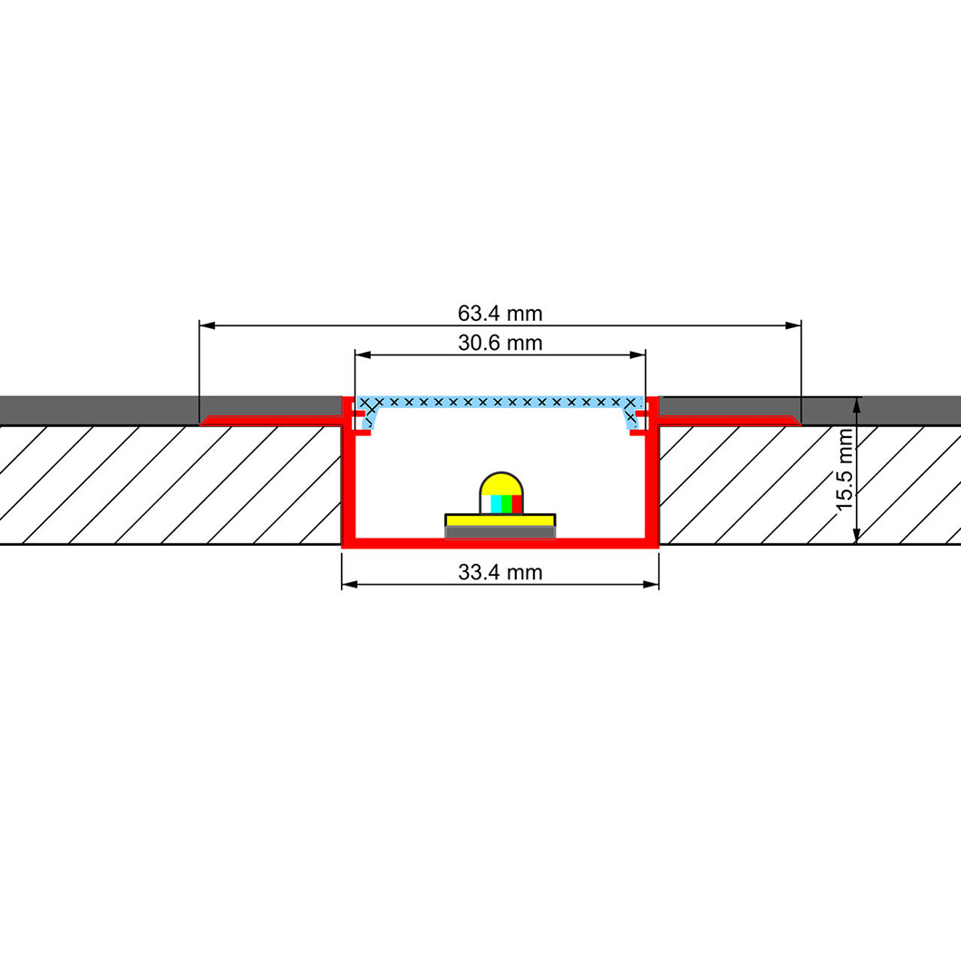 LED Profilelement V30 profile is for concealed and integrated installation in walls and ceilings. The V30 LED recessed profile is made from high-grade aluminium, in which a 3cm wide channel allows for more than one length of LED tape (if desired) to run through. If the distance of the LED chips is less than 15mm, a homogeneously illuminated line (without visible points) is created. Perfect for creating dramatic indirect lighting effects behind 'floating' structures. Opal supplied diffuser cover made of polycarbonate (PC) is weathering and UV-resistant and flame-retardant. The optional end caps, made of polypropylene (PP), additionally seal the profile.