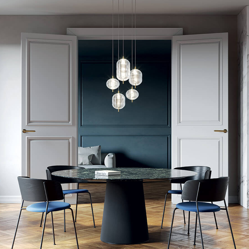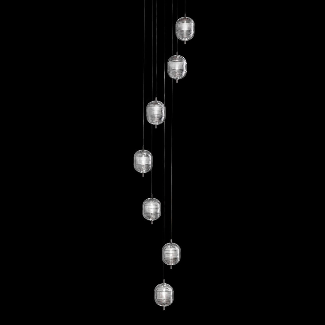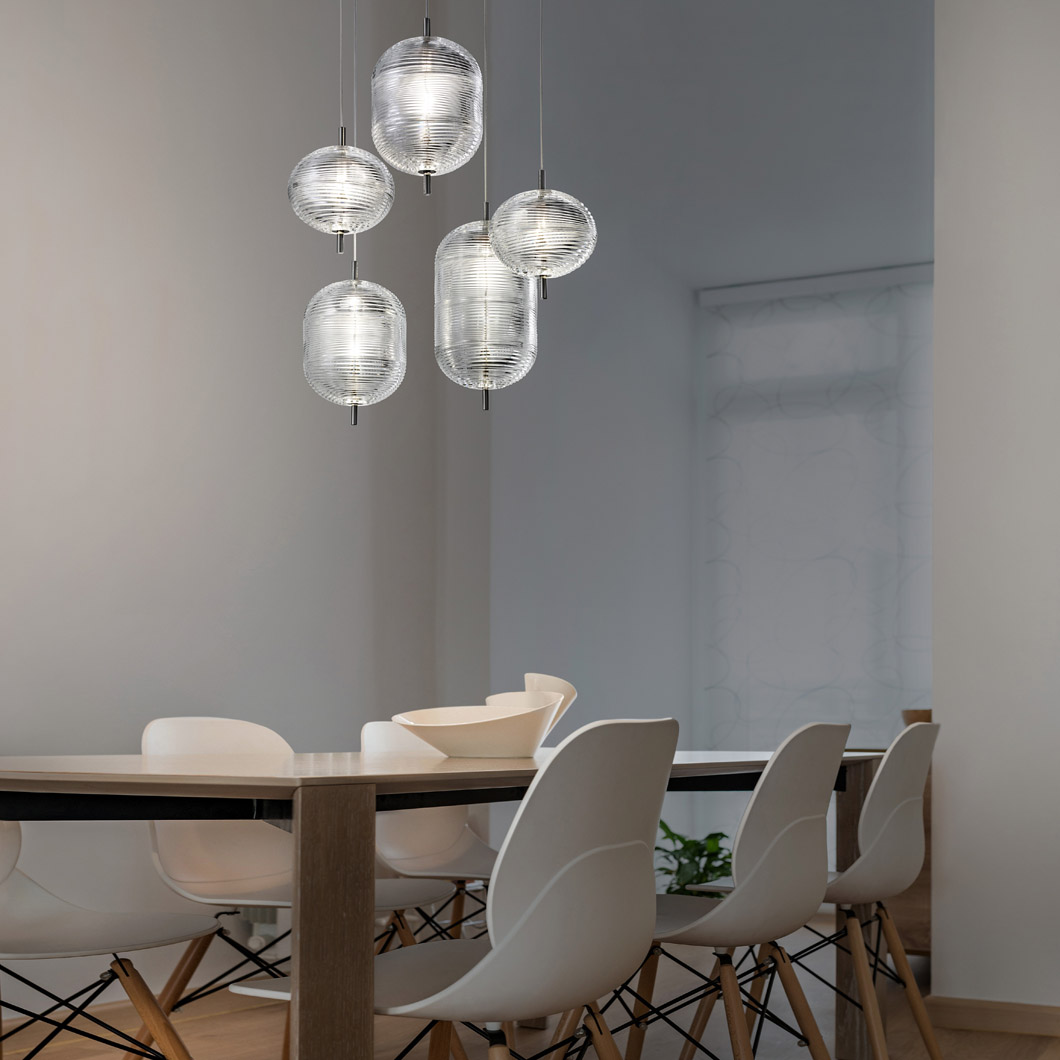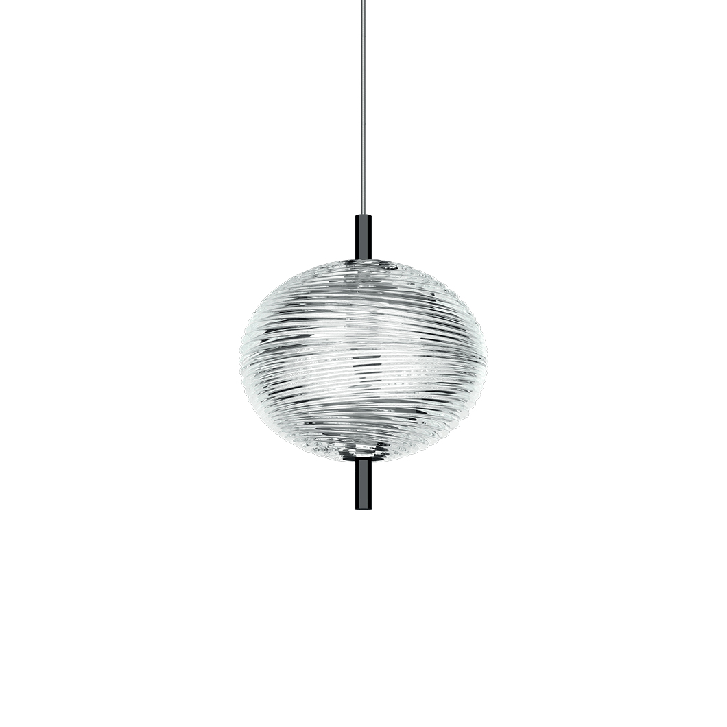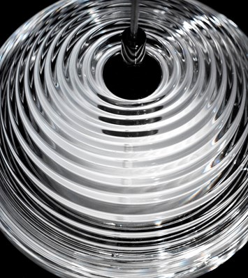 Designed by Luca Nichetto and launched in 2019, the Jefferson LED Pendant is a tribute to the psychedelic music and defining imagery of the Sixties. Through a specific pressing process, the Bohemian crystal glass shade incorporates clear inspiration from the iconic vortex motif design to create a kaleidoscope-esque aesthetic. The unique pattern of light diffused from the fine details on transparent glass surface creates an intriguing ambience. The Jefferson hangs gracefully from its Kevlar reinforced cables over the centre of a dining table or living room, using the crystal diffuser to emit a warm, delicate glow.
