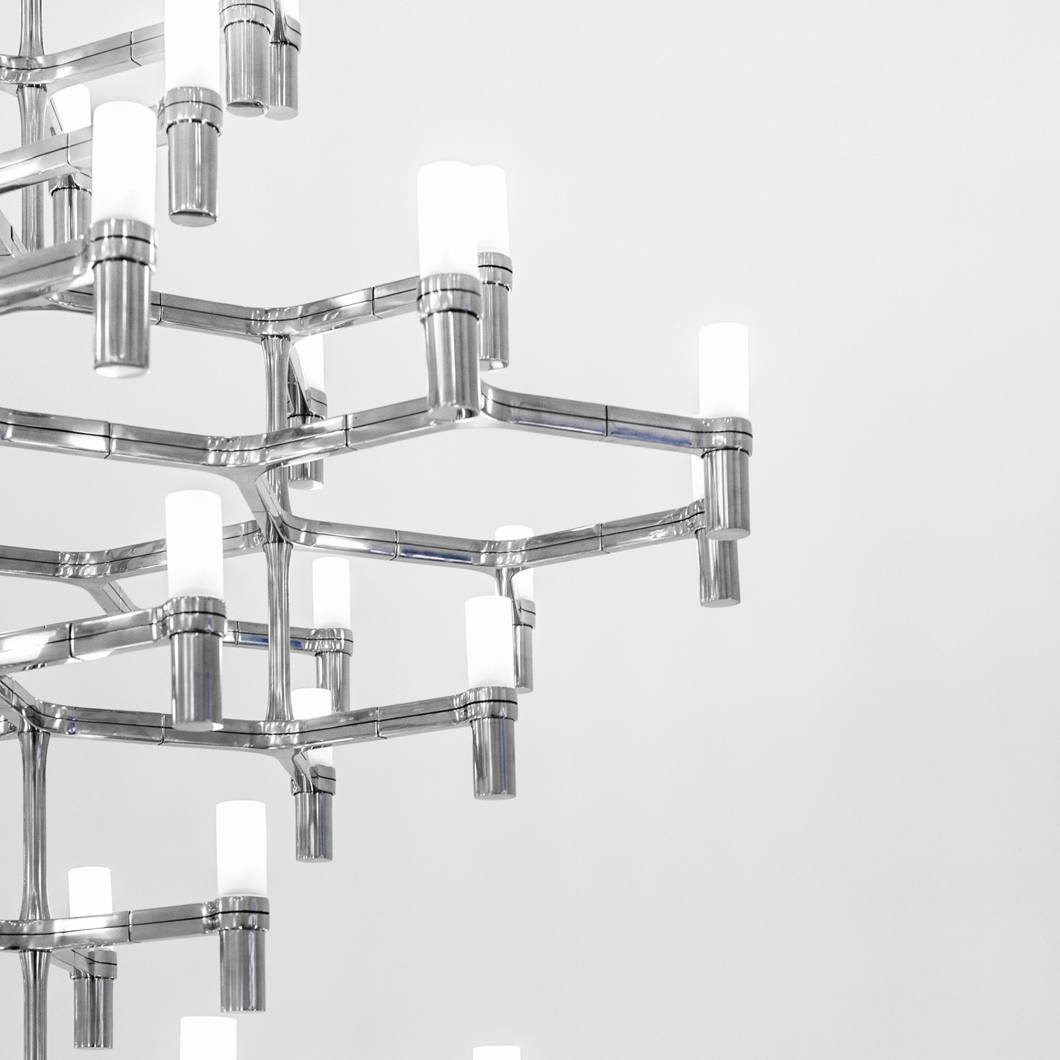The Nemo Crown Summa pendant has a modular structure in die-casted aluminium and sandblasted glass diffusers. Structure in aluminium hand polished, glossy gold plated or painted in matt white, matt black or gold. Widespread light. Transparent cable. Red cable on request.