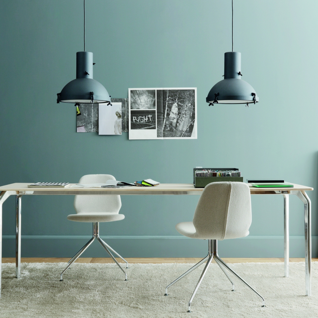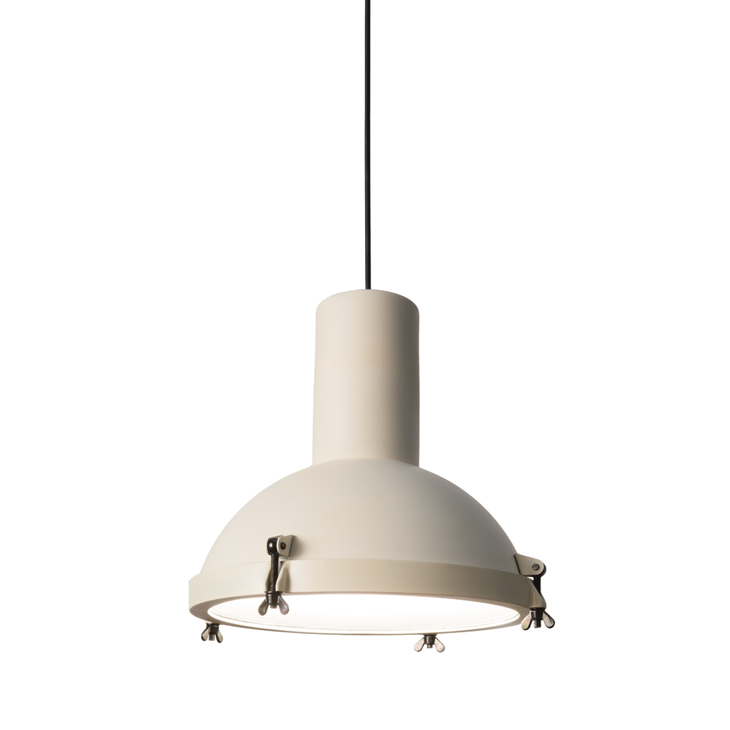 The Nemo Projecteur 365 pendant of Le Corbusier was designed for the Chandigarh High Court, India, in 1954. Aluminium body painted in night blue, white sand or moka. Diffuser glass curved and sandblasted in the inner part. Painted body, base and canopies. Screws and small metal parts black chromed.