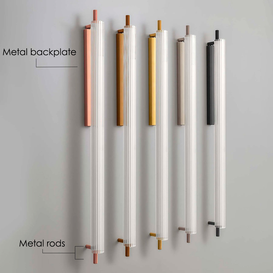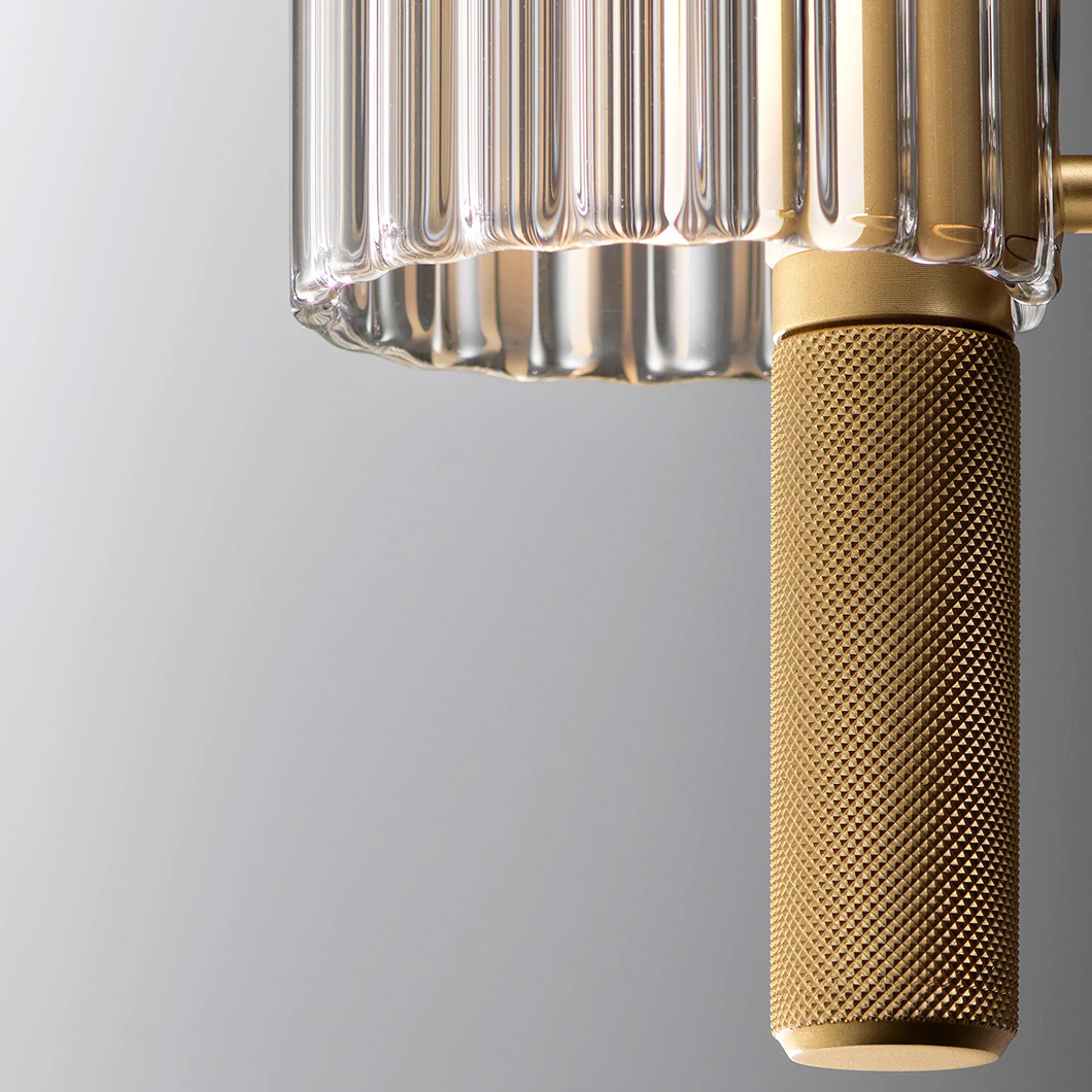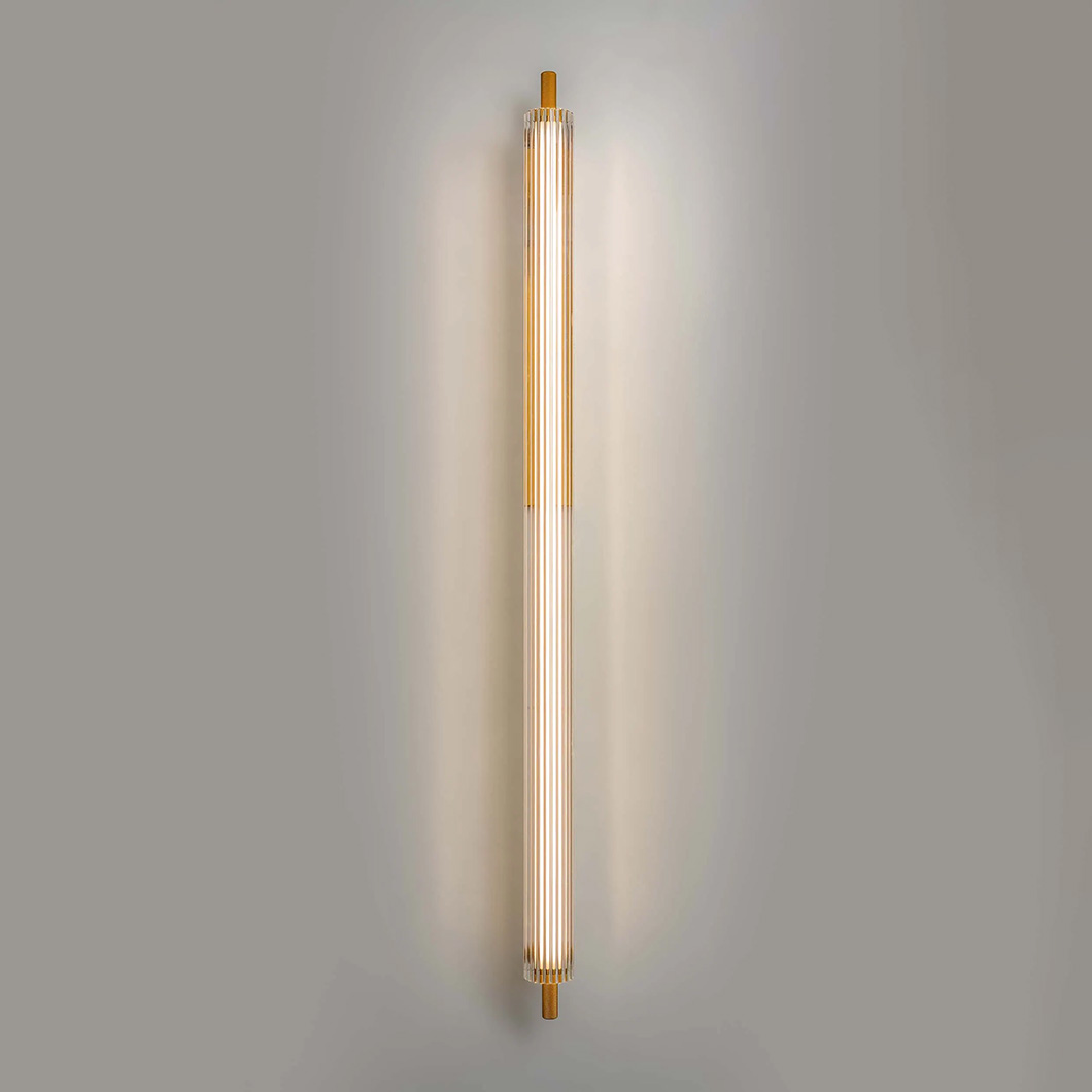 Trisel Ap by OLEV is a modern linear wall light equipped with a 27W LED light source. The elegant, handcrafted fixture features a transparent, fluted glass diffuser secured by cylindrical metal rods and a slender metal backplate. The protruding metal ends display delicate knurled designs, signifying a great attention to detail in the geometric pattern.