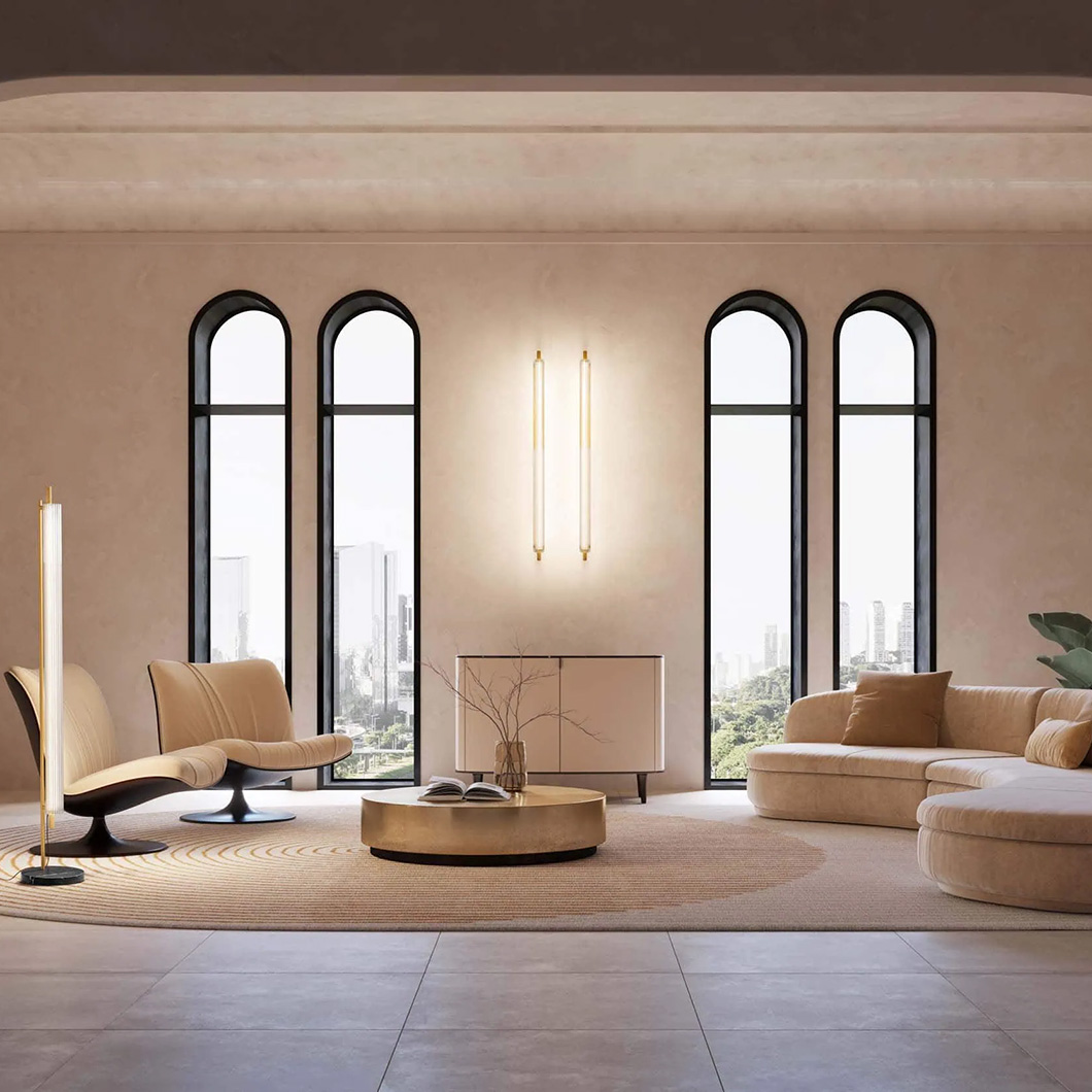 The two metal components can be finished in the same coating or differing ones, depending on individual preferences. Choose from 5 sleek shades: super-matt black, painted burnished, rich gold, earth brown, or titanium. Each finish offers a distinctive look that will complement a range of contemporary interiors. The stylish luminaire is chicly positioned in an inviting hallway or a cosy lounge to emit a soft, ambient glow.