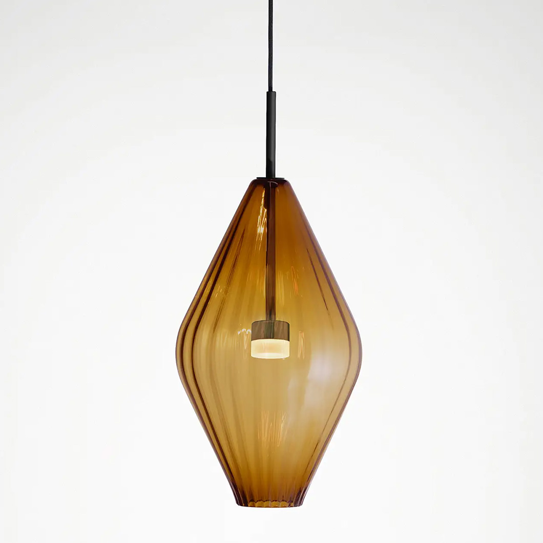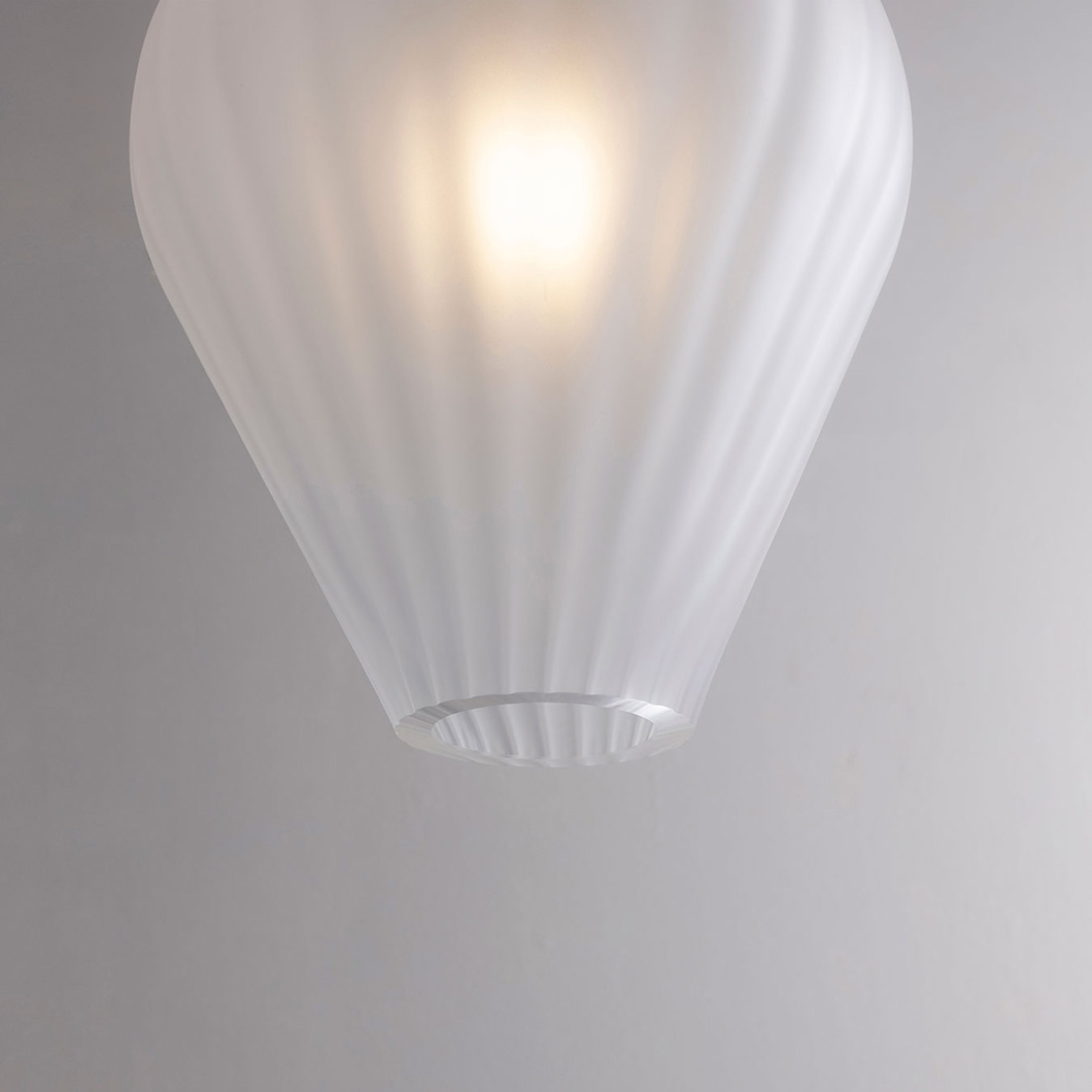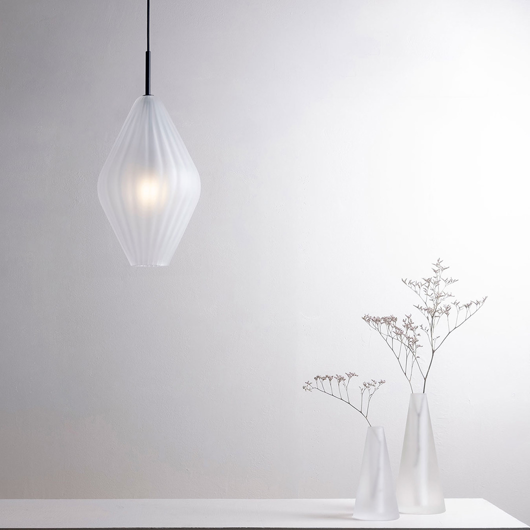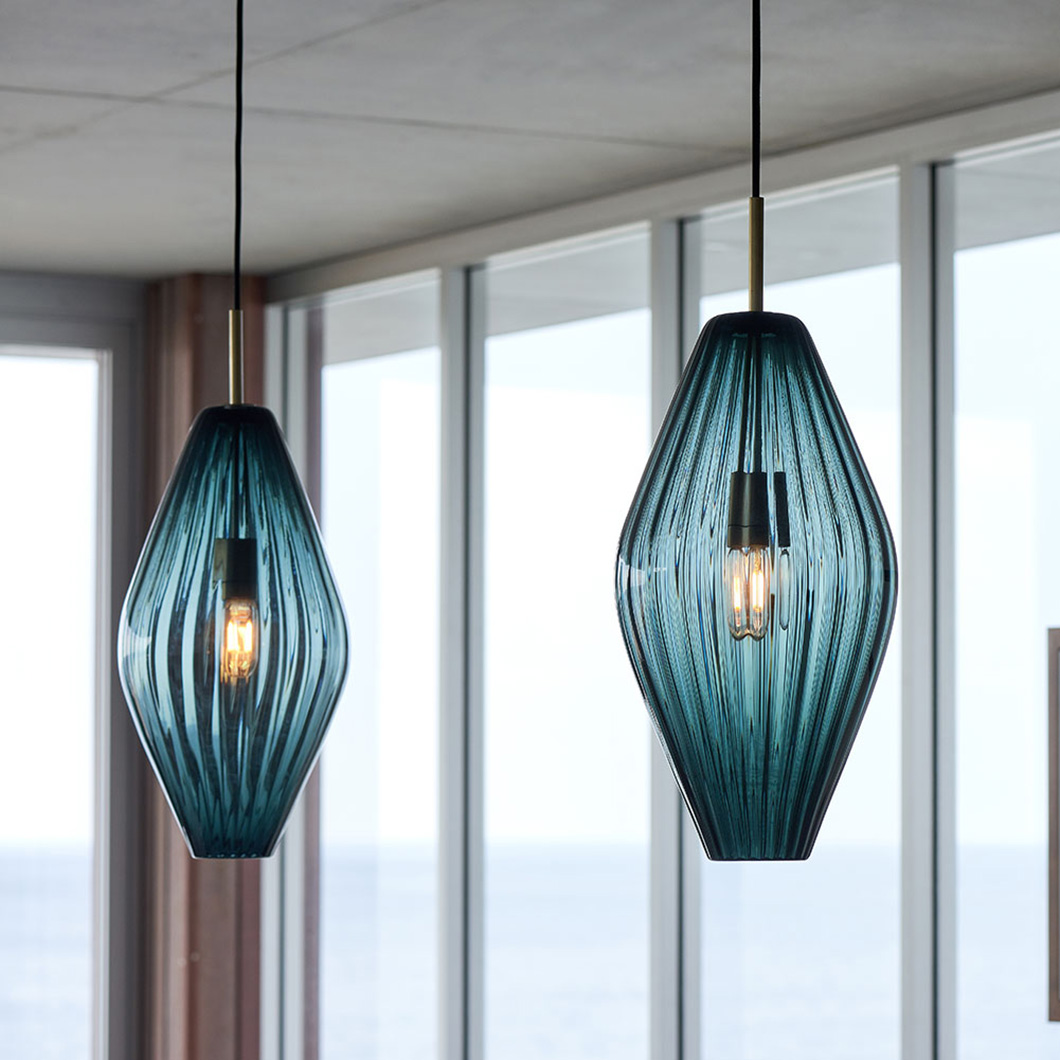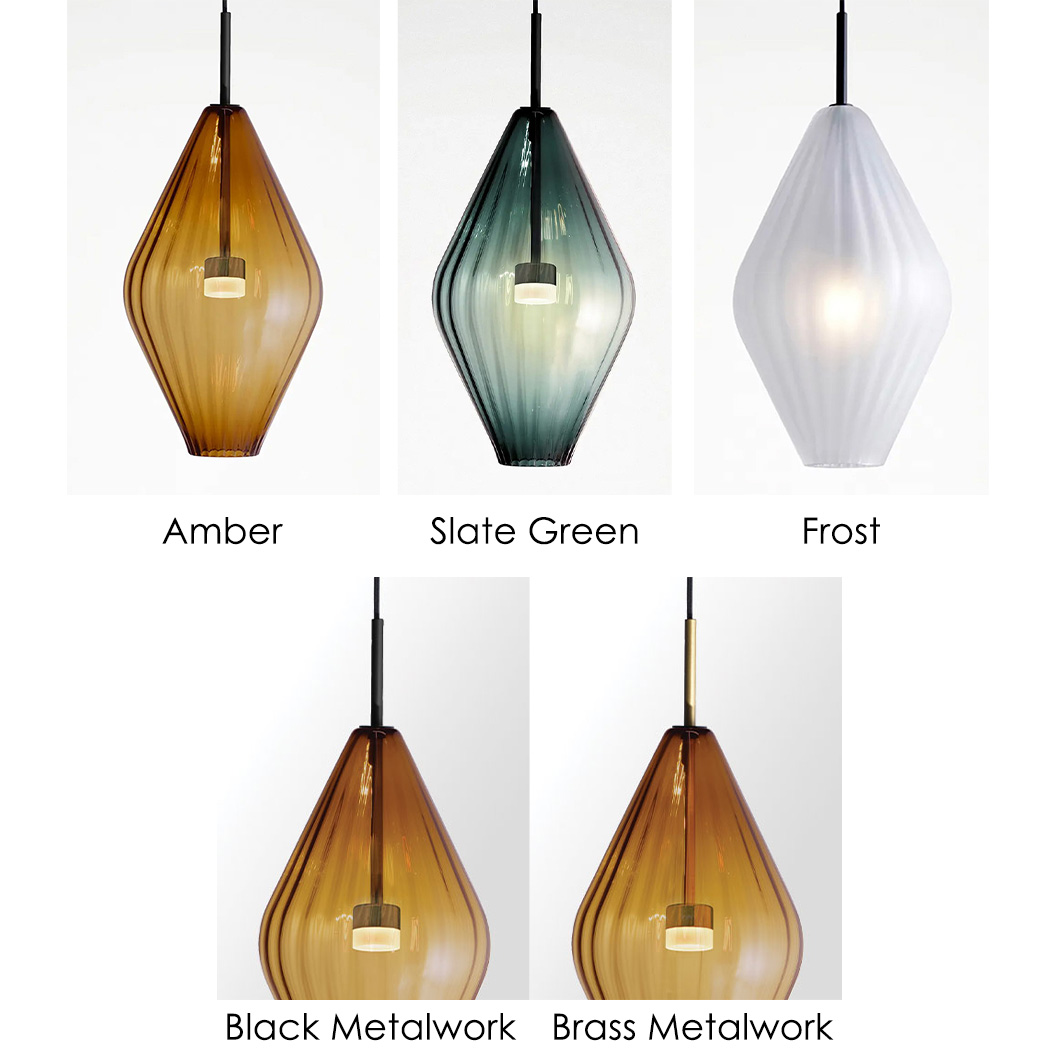 The intricate fluted glass shade is hand formed by skilled artisans and available in three finishes: slate green, amber, or frost. The minimal internal fitting is finished in satin brushed brass or black anodised aluminium. 2m black braided flex cable with seamless canopy.
