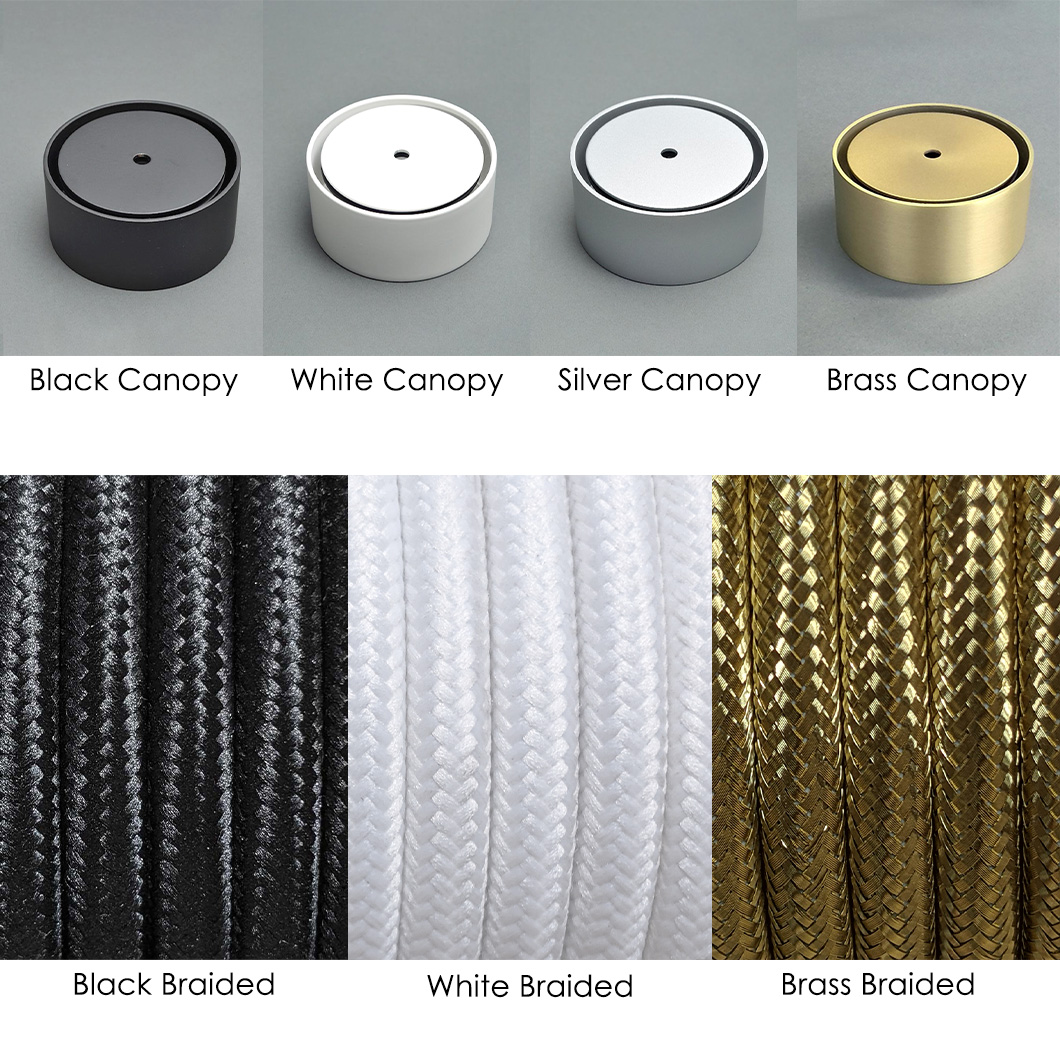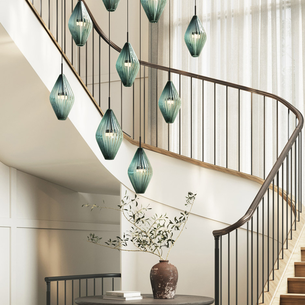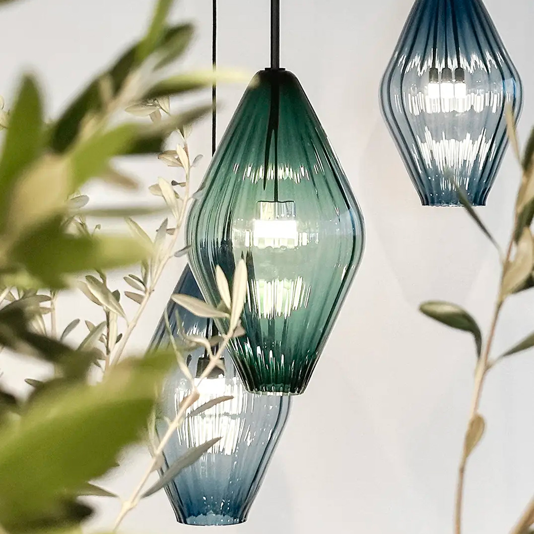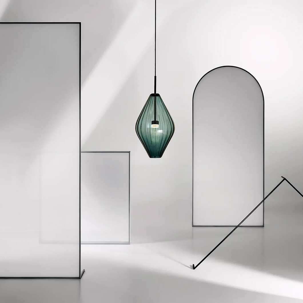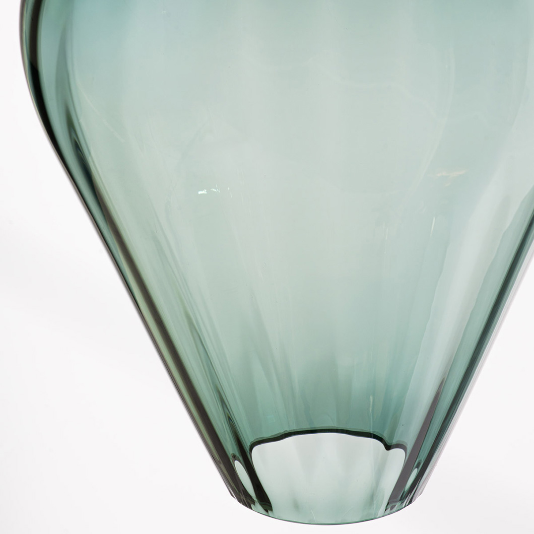 The intricate fluted glass shade is hand formed by skilled artisans and available in three finishes: slate green, amber, or frost. The minimal internal fitting is finished in satin brushed brass or black anodised aluminium. 2m black braided flex cable with seamless canopy.