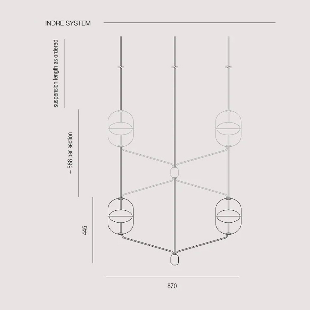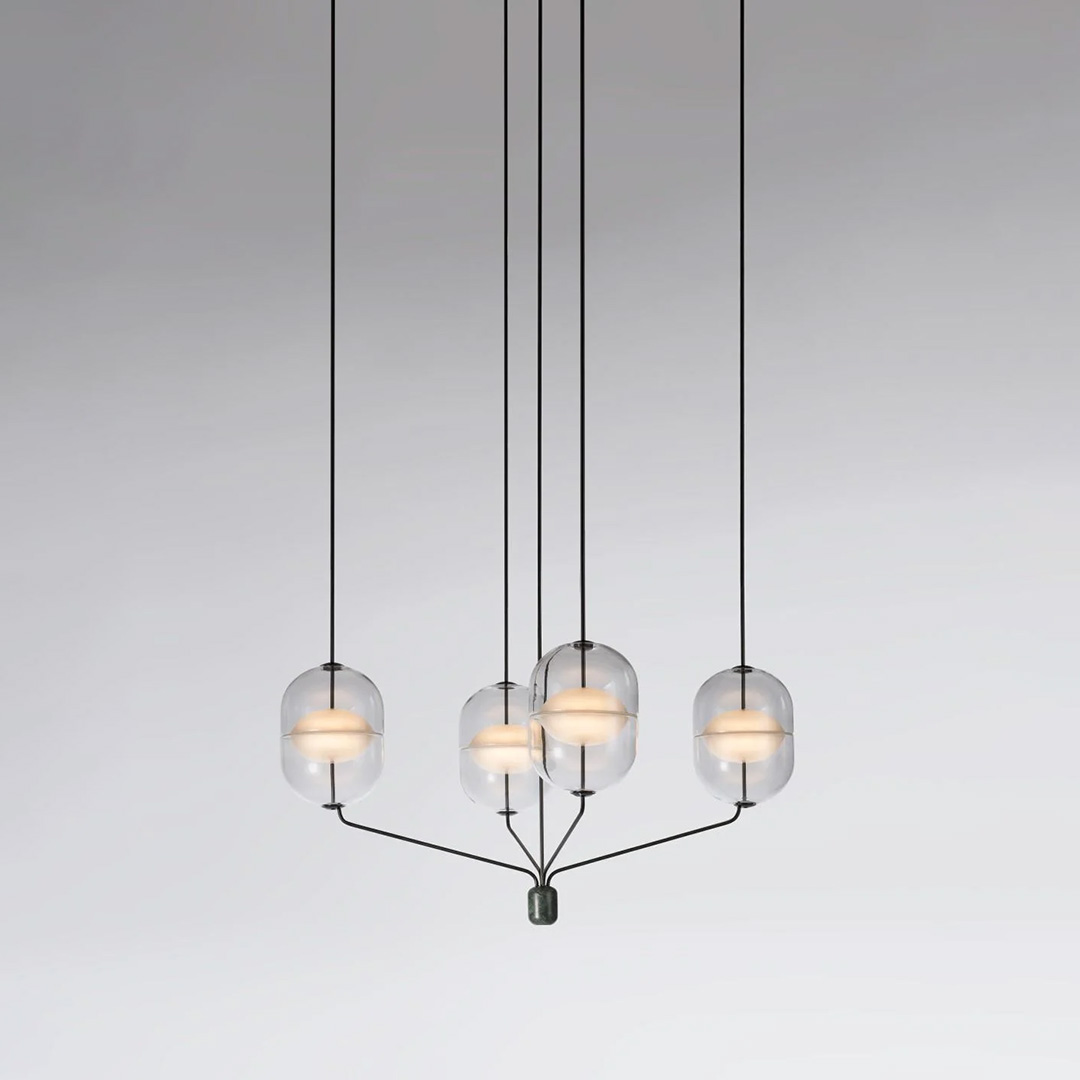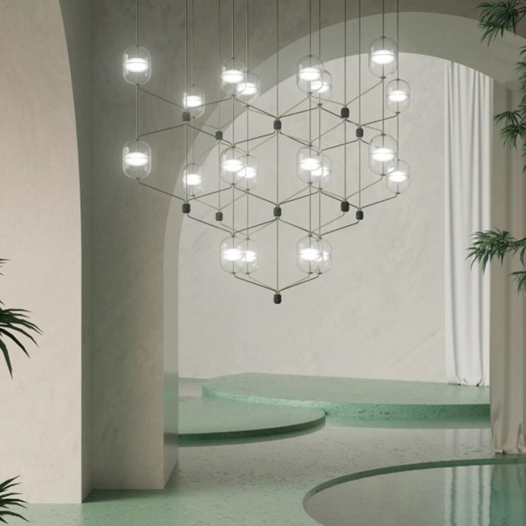 The Indre pendant series by Rakumba is a stylish and unique glass luminaire. Under this option, a number of chandelier compositions are avaliable to choose from, all featuring customisable metal framework and anchors. New to Darklight Design for 2023, Indre's uncomplicated and beautiful style allows it to fit perfectly into contemporary interior design styles. The Indre pendant in its chandelier compositions is avaliable in four sizes, relating to the number of modules desired and arranged pattern.