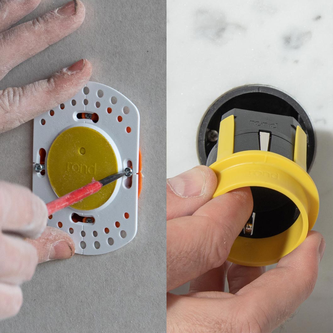 - Thanks to the rond removal tool, electrical connections remain accessible, even after plastering