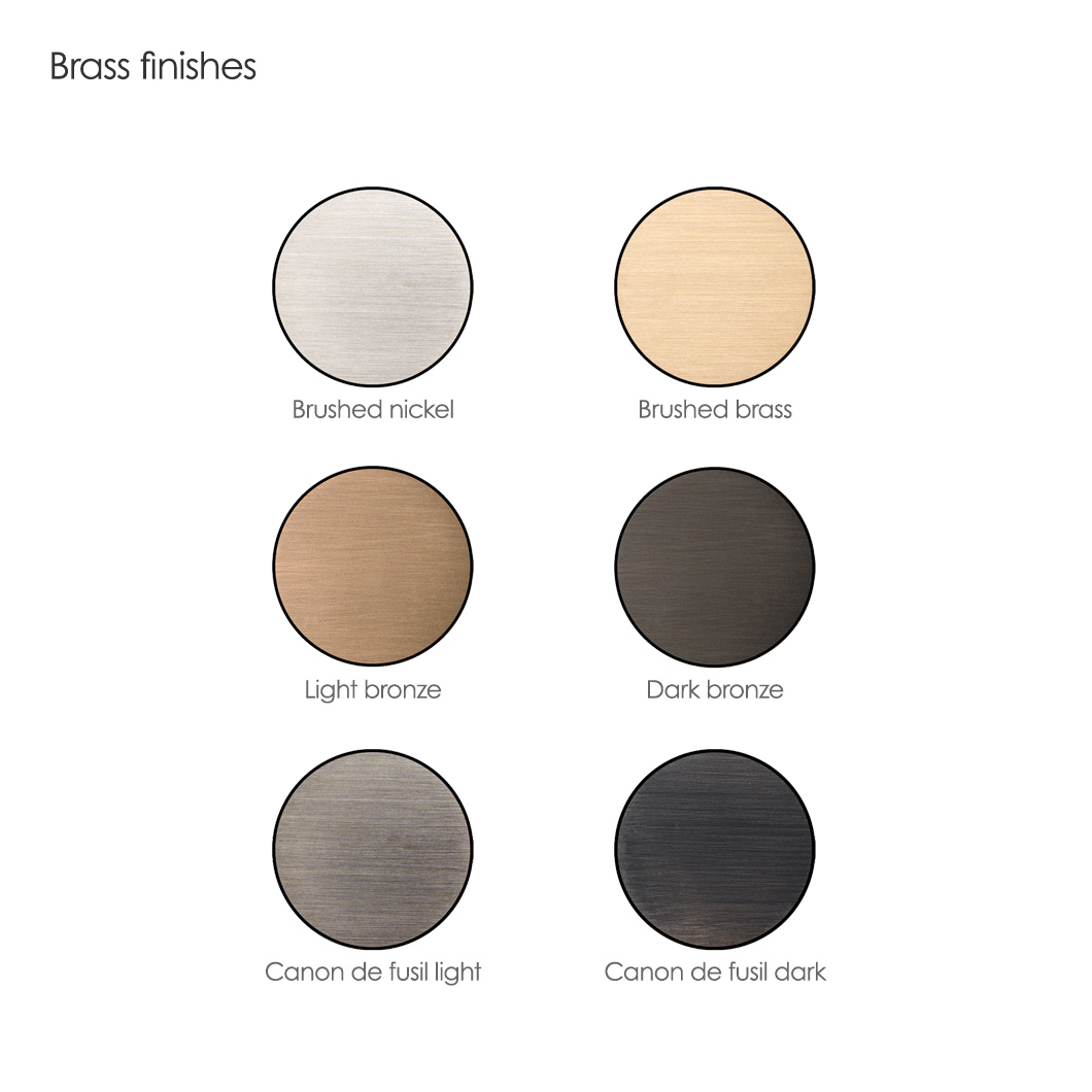 Available with RJ45 UTP, coax, hdmi or audio connections. Finished in aluminium white or black, or in custom brushed nickel, brushed brass, light bronze, dark bronze, canon de fusil dark (gun metal) and canon de fusil light.
