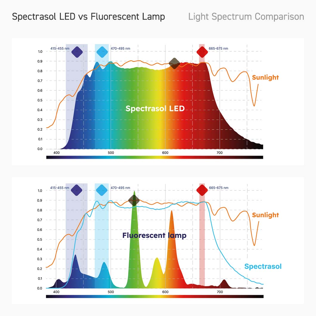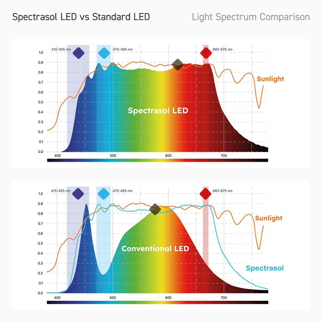 Standard LED lighting is mostly harmful to eyesight, cognition, sleep and health, due to its high blue-light peaks, spectral gaps and high levels of harmful invisible LED flicker. SpectraSol’s patented technology is flicker-free and engineered to replicate the full, continuous spectrum of natural sunlight by suppressing the harmful blue light range and balancing the precognitive cyan and regenerative red light ranges.