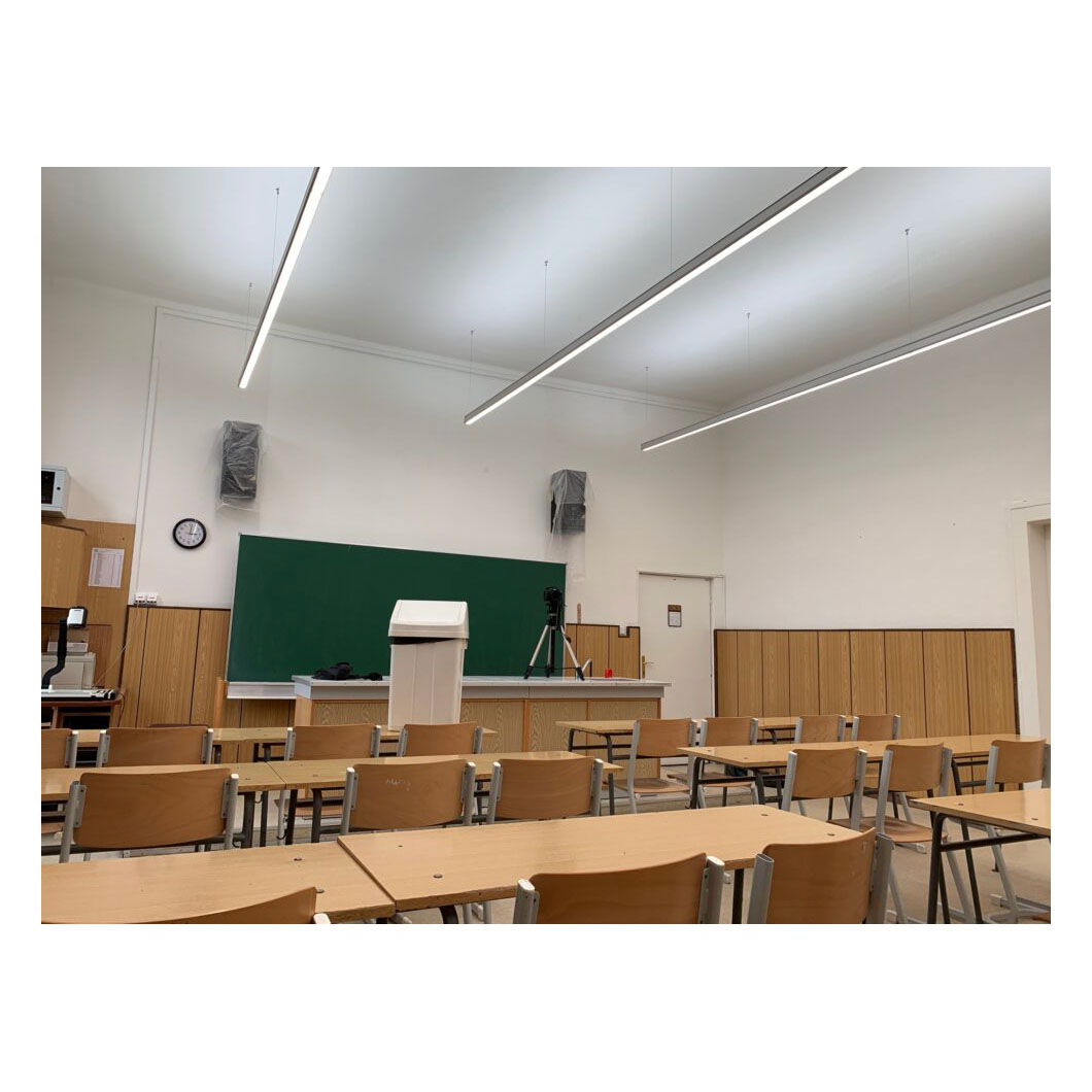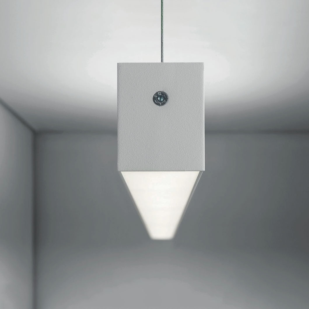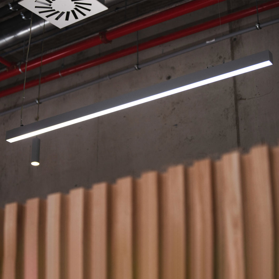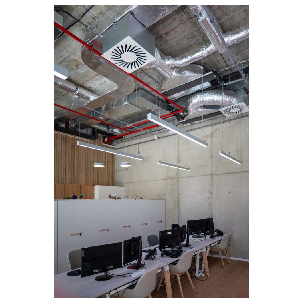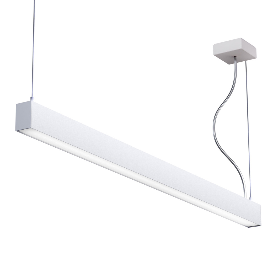 Extruded aluminium pendant with a maximum suspension drop of 2m. Available in 3 lengths: 1127mm, 1668mm or 2249mm. Equipped with a low flicker effect LED driver. On/off or DALI dimmable. Finished in powder coated white RAL 9003, black RAL 9005 or silver TIGER 09/90530.