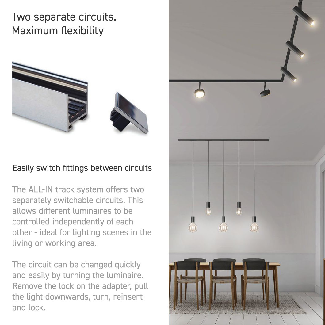 Featuring two switchable circuits, the ALL-IN track system allows different luminaires to be controlled independently of each other. Create your own flexible lighting scenes, perfect for lighting living spaces and working areas from the same track.