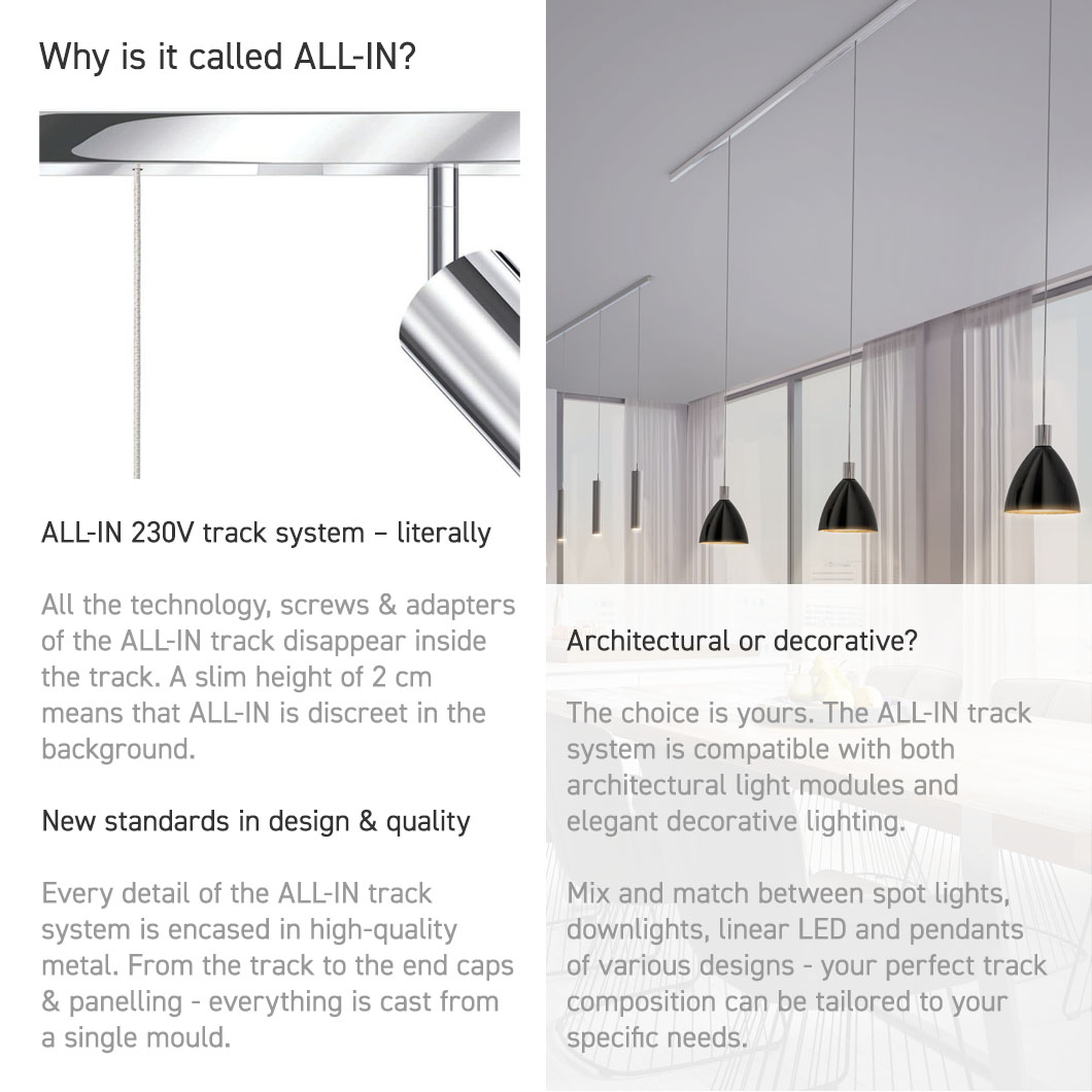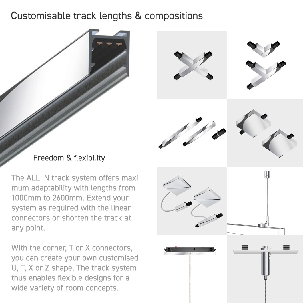 From the track to the end caps and panelling - everything is cast from a single mould in high quality metal. The 230V mains powered track means no need for drivers, which helps ALL-IN to hide everything within the track. With customisable lengths from 1000mm to 2600mm and linear connectors to join track lengths, ALL-IN can easily adapt to fit your requirements. And with a full suite of corner, T or X connectors, it's easy to create U, T X or Z shapes. The limit is your imagination.