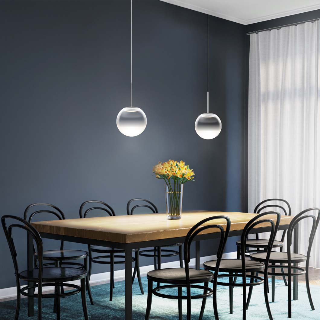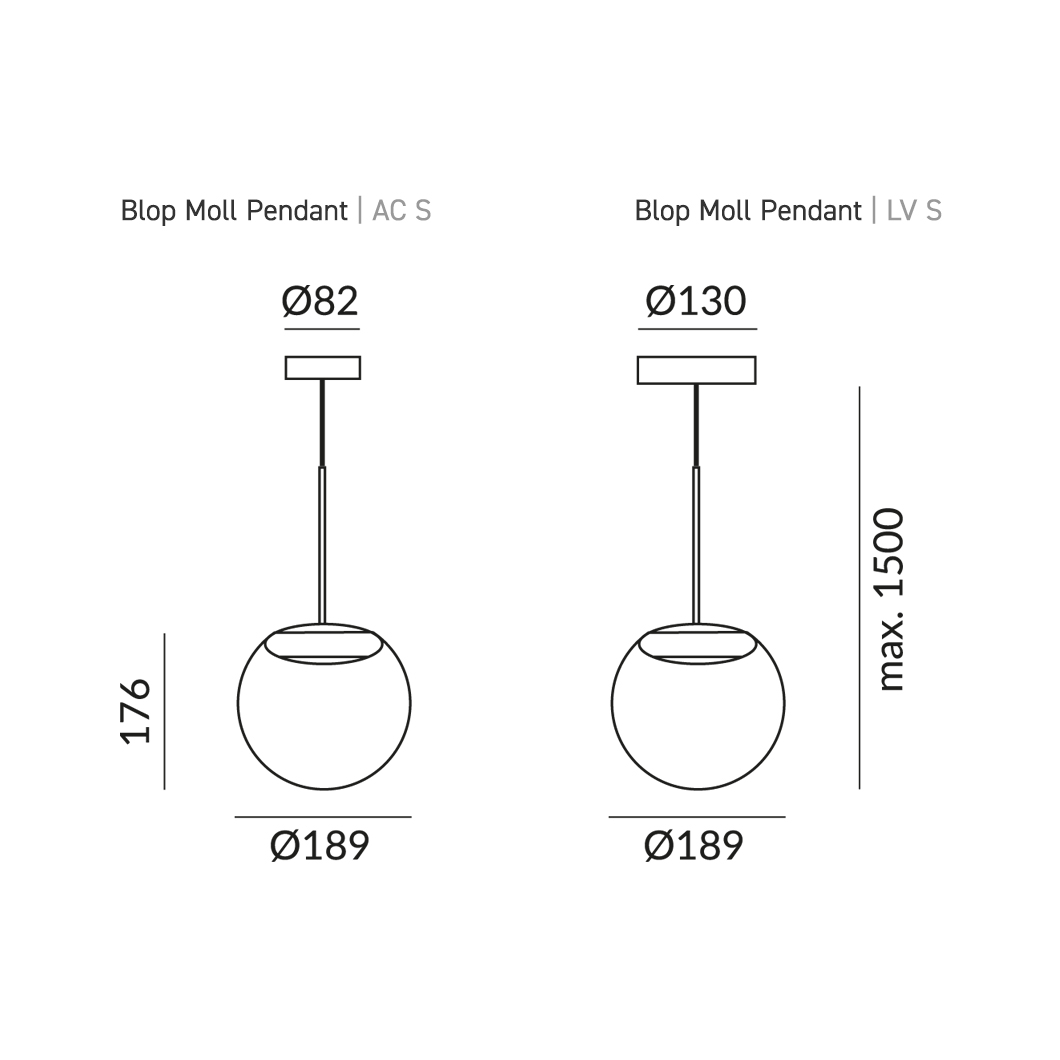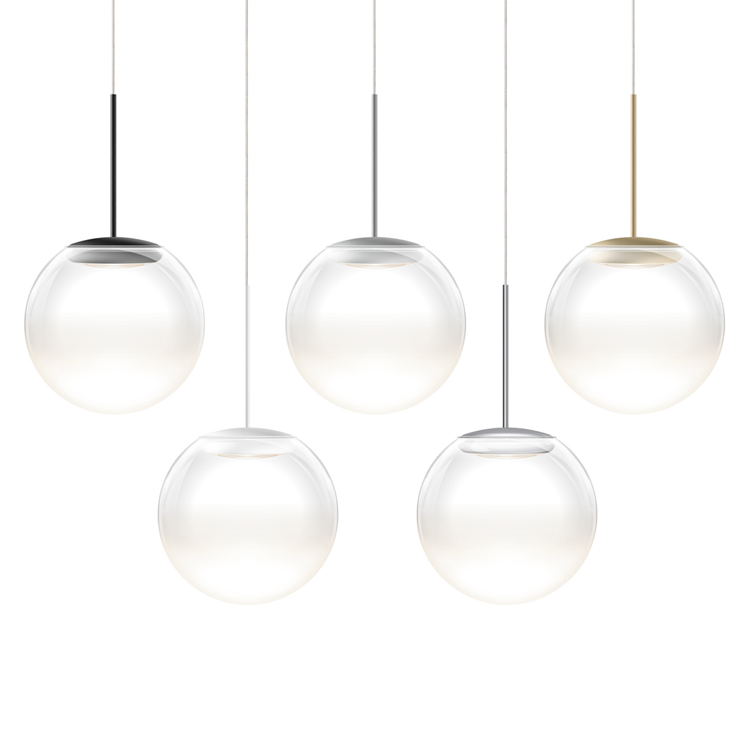 With the addition of a chic glass diffuser, the Blop Moll transforms the Blob pendant into an elegant suspension light. The transparent glass diffuser is enhanced by the choice of five finishes: black, white, matt chrome, chrome or champagne/white. A 230V mains dimmable suspension light, Blop Moll is available in 2 LED versions: 12W (AC S) which produces 950 lumen or 15W (LV S) with a brighter 1200 lumen output. Blop Moll can be installed individually, in rows over a table or kitchen island, or in a cluster with a canopy. This versatility makes the Blob Moll pendant perfect for both residential or commercial projects that require a minimalist light fitting.