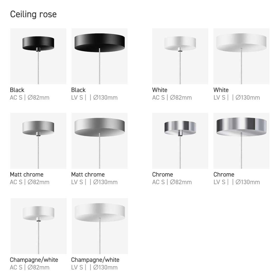 Blop Moll has a 2700K warm white LED - 3000K is available on request, and for the LV S version DALI and Dim2warm are also available on request. The LV S version has a larger ceiling rose, see the Specification tab for more information.