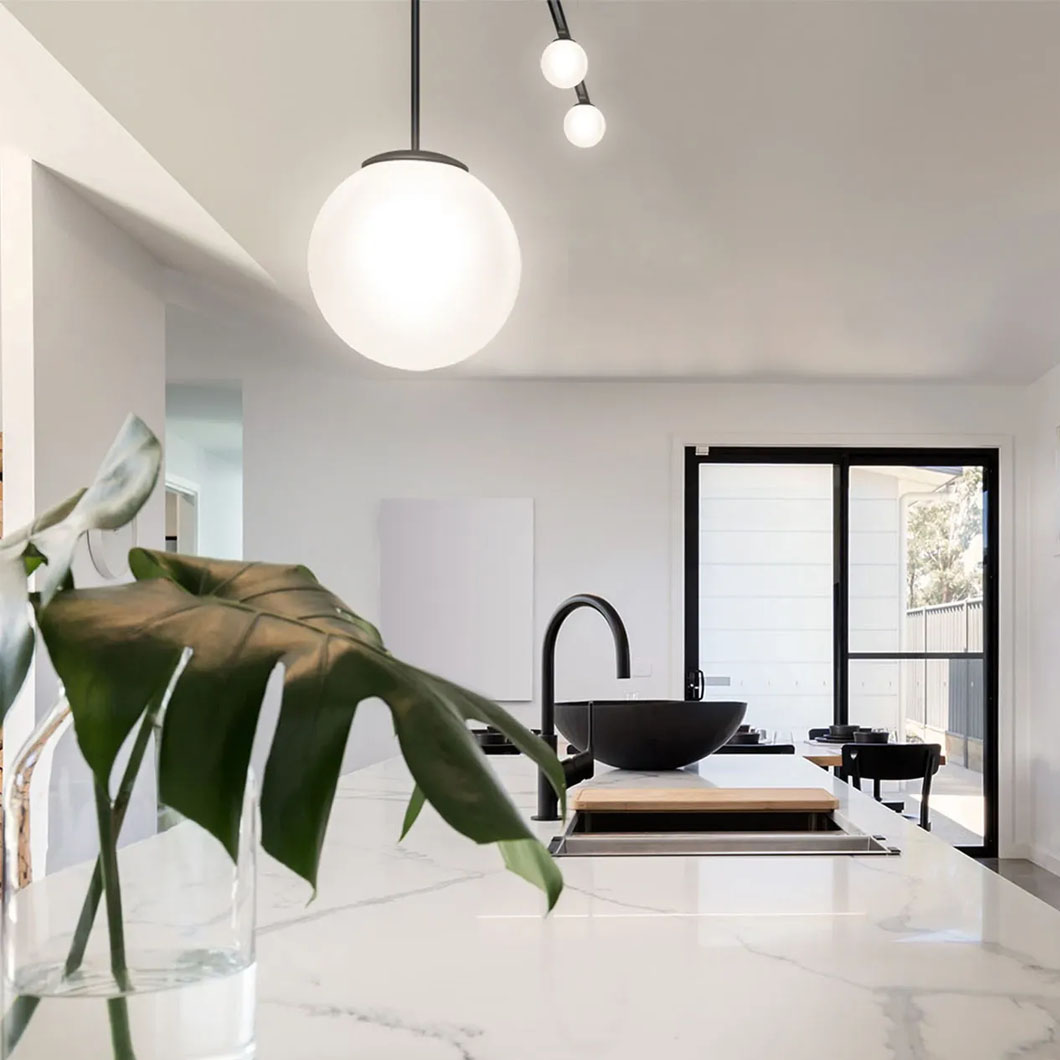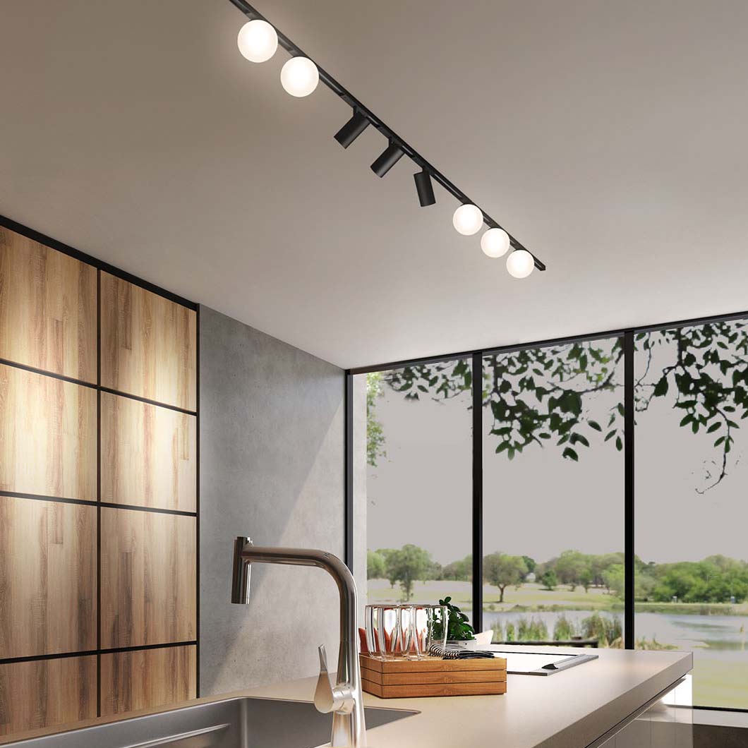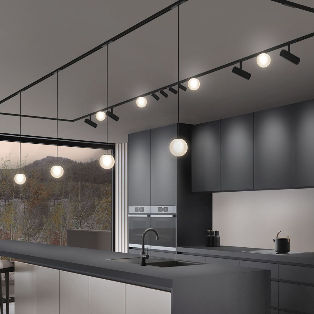 A track system with such a minimalist look deserves perfectly matched light modules. Choose from spotlights for precise highlighting, elegant LED globe lights for a soft, ambient glow, or aesthetic pendant lights with delicate glass spheres to create show-stopping features over a dining table or kitchen island.
