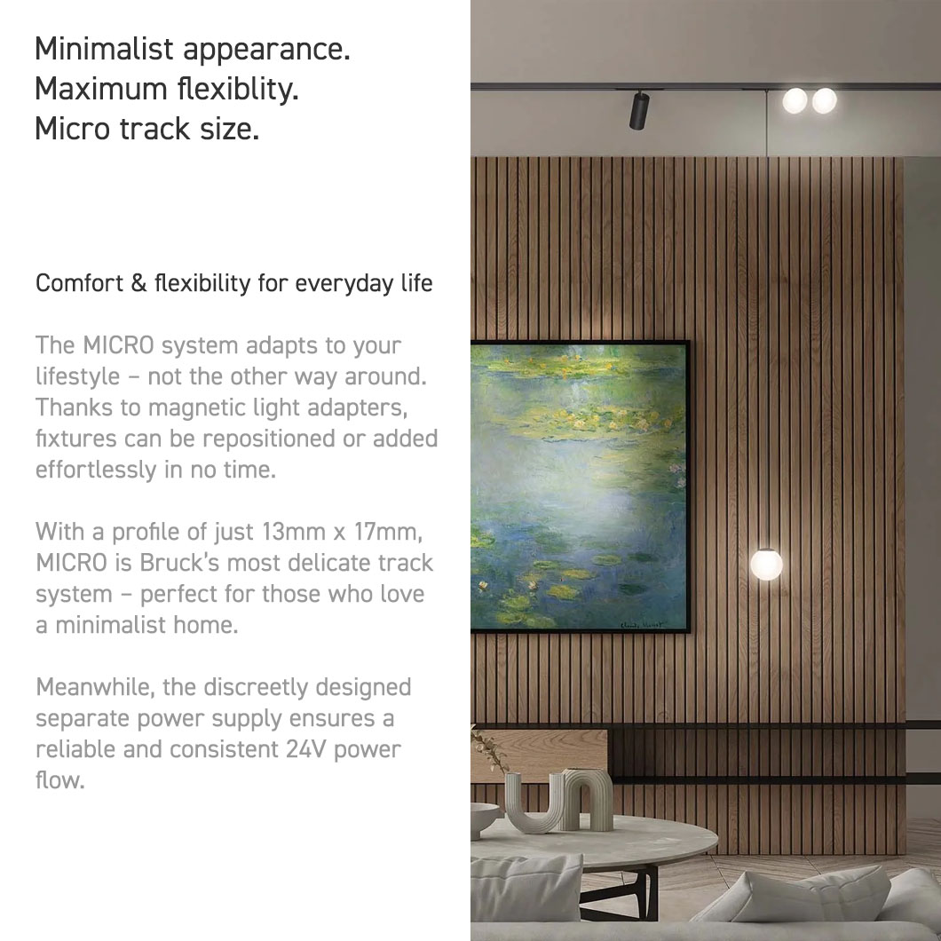 With dimensions of 13mm x 17mm, the MICRO 24V track system by Bruck is their available track. Contemporary yet understated, the elegant MICRO track combines a minimalist look with a discreetly designed low-voltage 24V power supply.