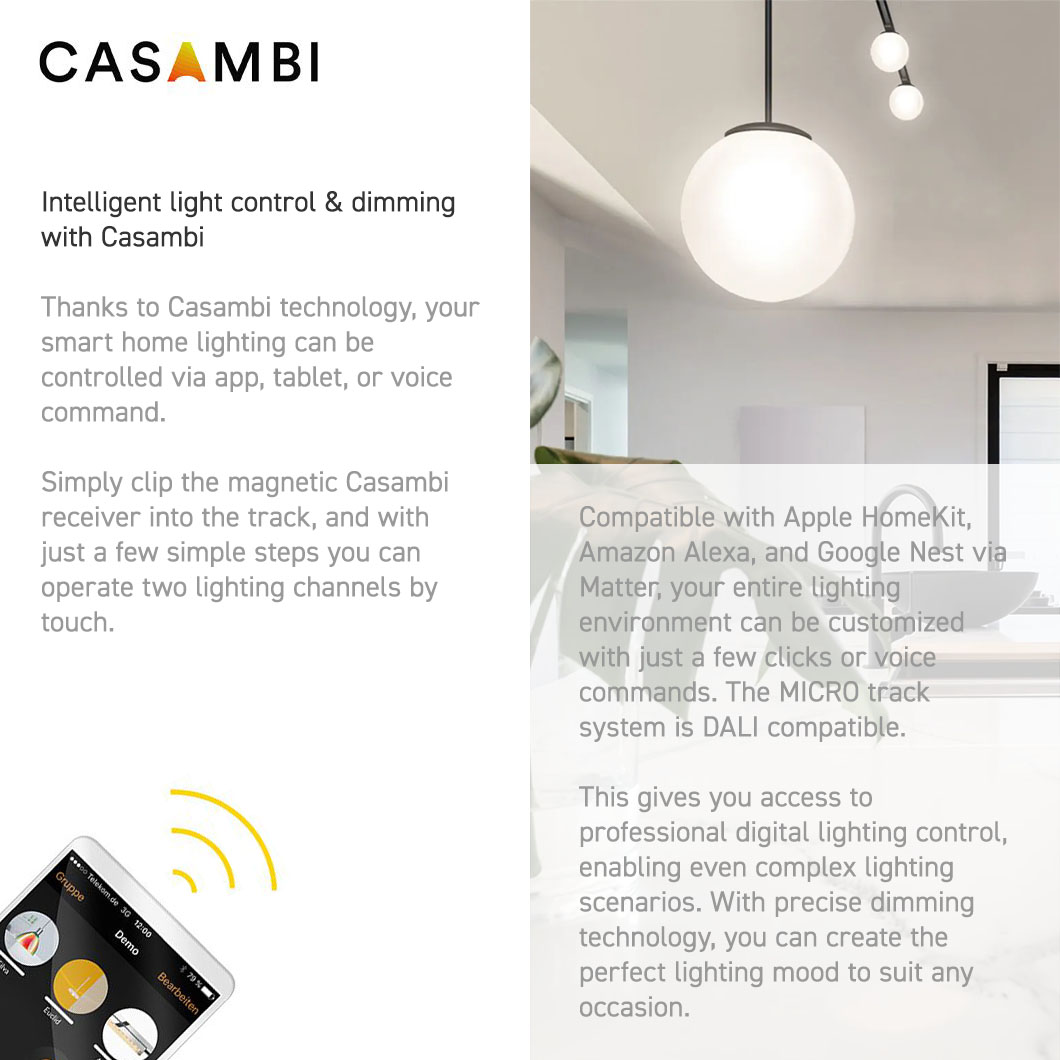 The MICRO track system can also be used with the Casambi dimming units to give flexible control of all the lights in your home. Create the perfect mood for all situations wirelessly via Bluetooth 4.0 and save them as pre-set scenes on the Casambi app from your smartphone. Or control the scene at the touch of a button, either with Casambi wireless wall switches or with an off-the-shelf push dimmable on/off switch. Compatible with Apple HomeKit, Amazon Alexa, and Google Nest via Matter, your entire lighting environment can be customized with just a few clicks or voice commands.