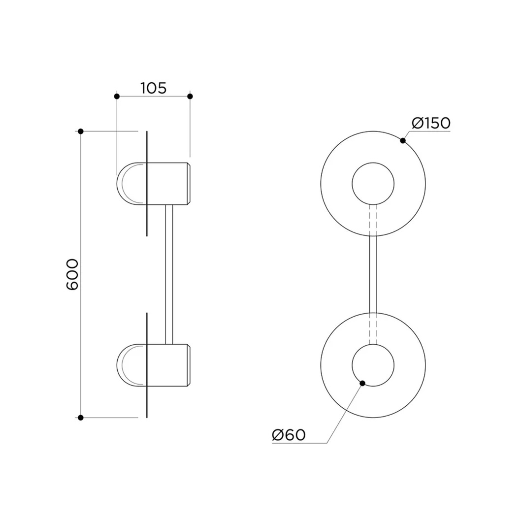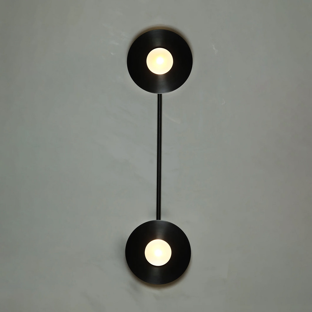 The Alba Double Wall Light combines retro style with modern aesthetics. This sleek wall fixture can be mounted vertically or horizontally, featuring two circular discs connected by a metal rod. Alba is available in both standard and XL sizes, bringing a comforting ambience to a contemporary lounge or a statement piece in a minimalist space.