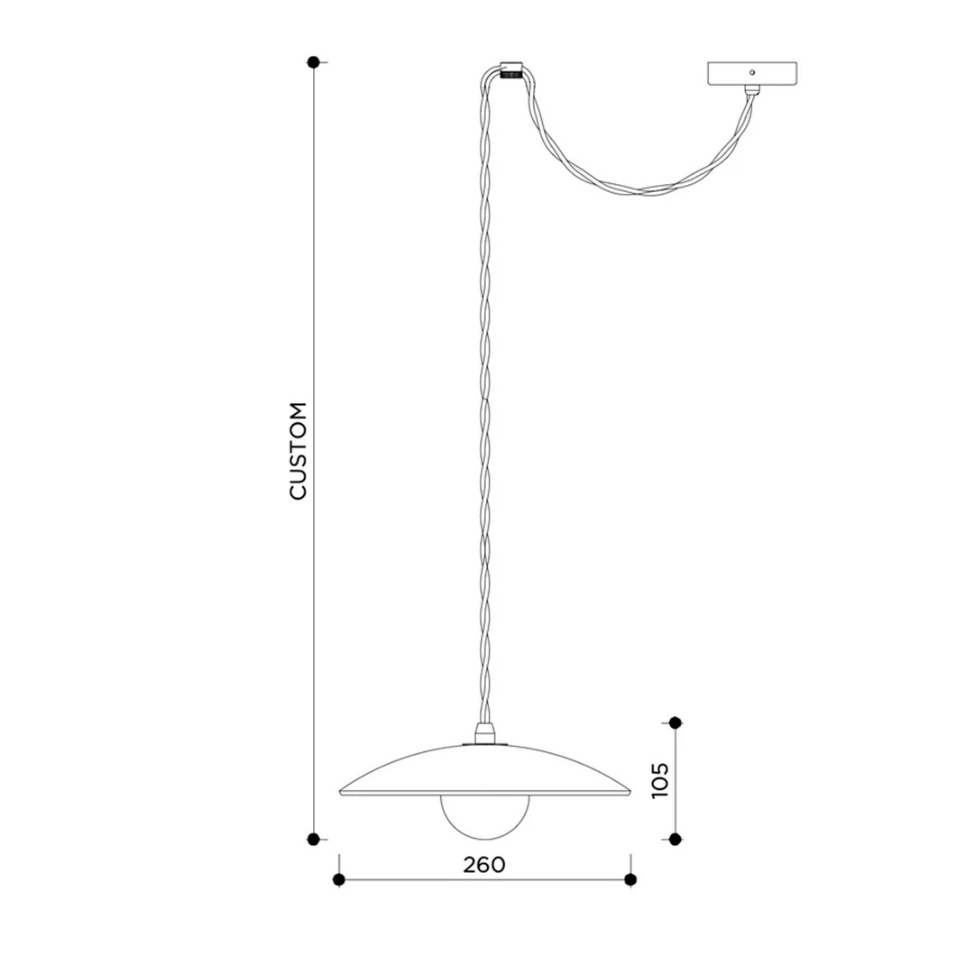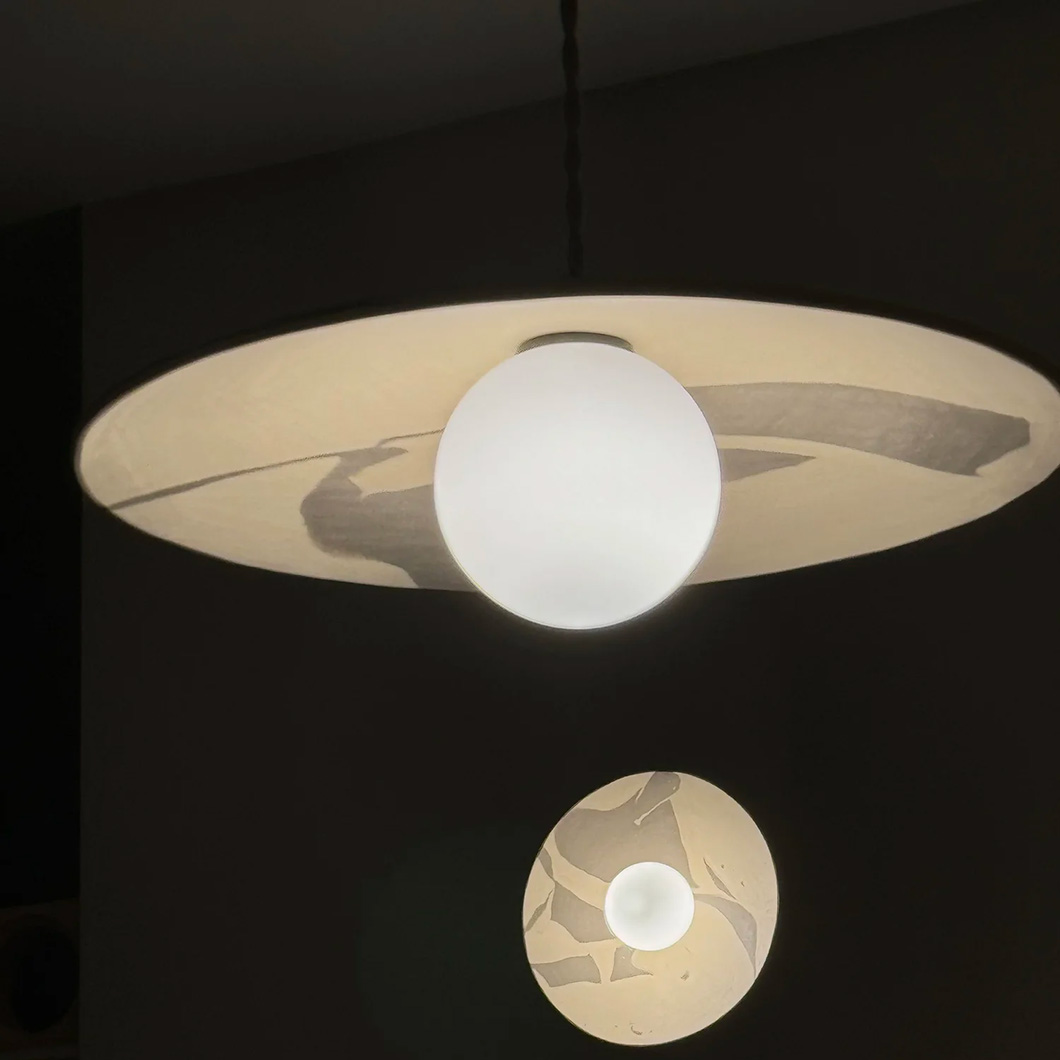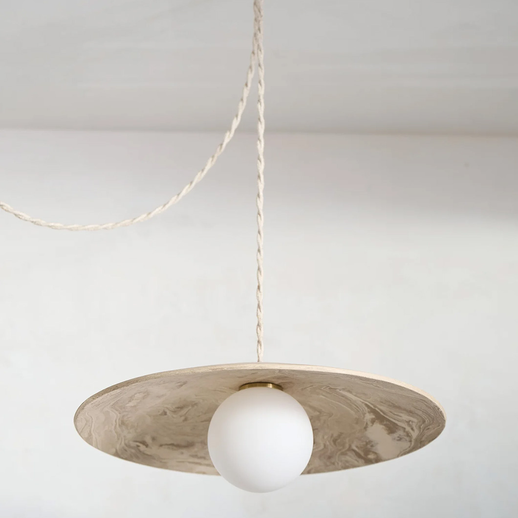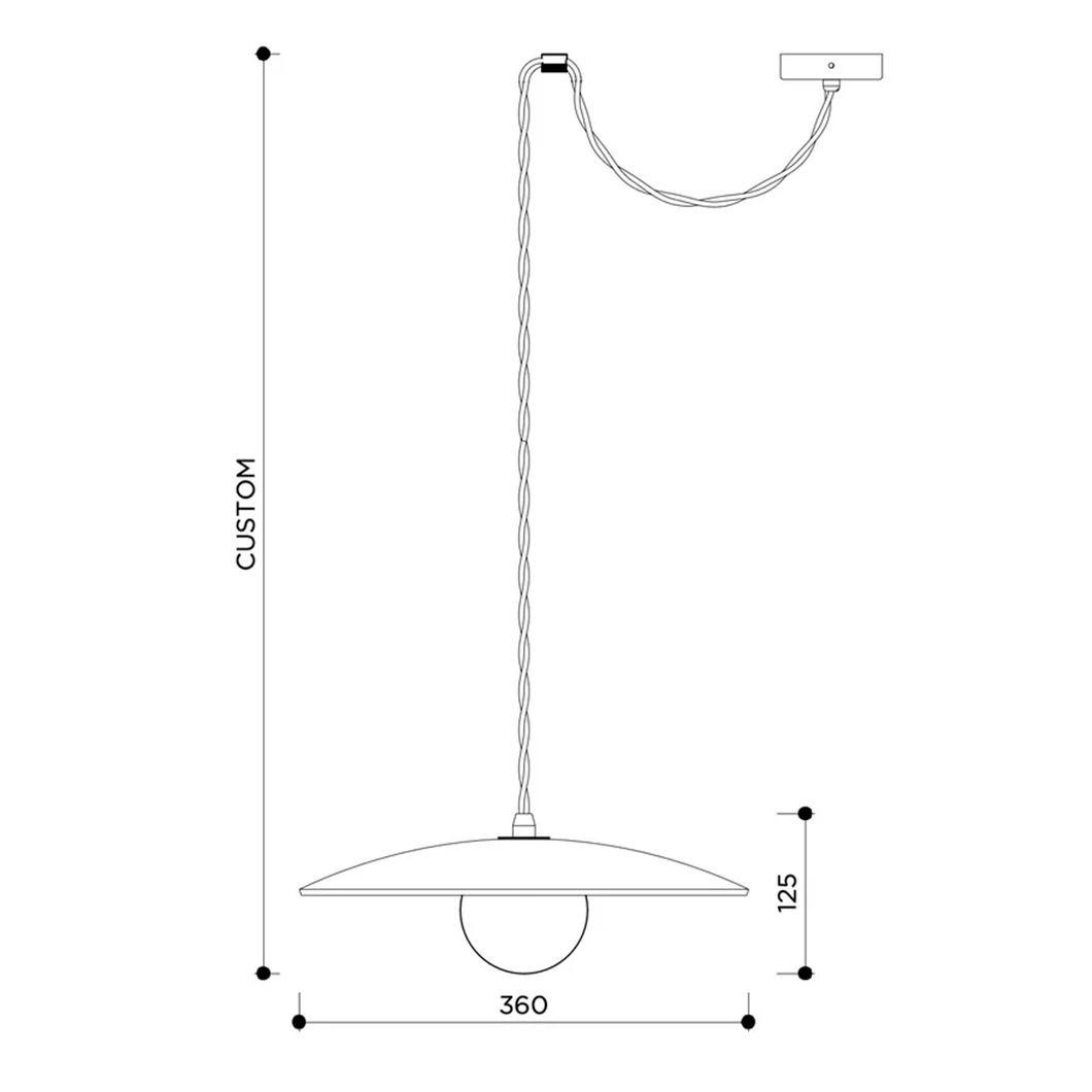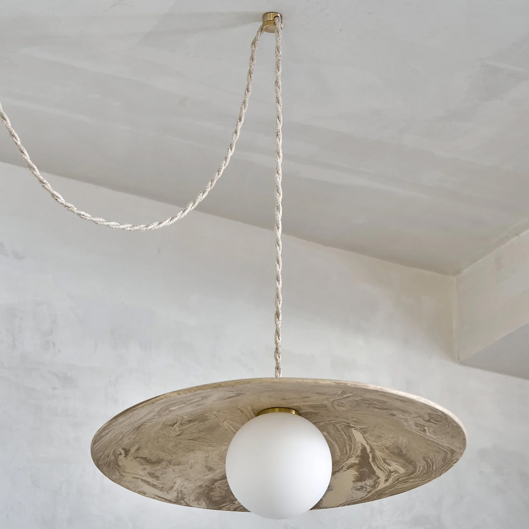 Choose between two diameters: Ø260mm or Ø360mm. The pendant's structure and ceiling rose are crafted from brass, available in 8 modern finishes: brushed brass, polished brass, brushed nickel, polished nickel, brushed aged brass, blackened brass, matt white, or matt black. The ceramic disc is available in 6 finishes: cream stratum, ocre stratum, red stratum, black stratum, cream and grey leather, and grey and cream leather. Finally, the suspension cable is available in natural linen, golden, slate grey, or banda black.