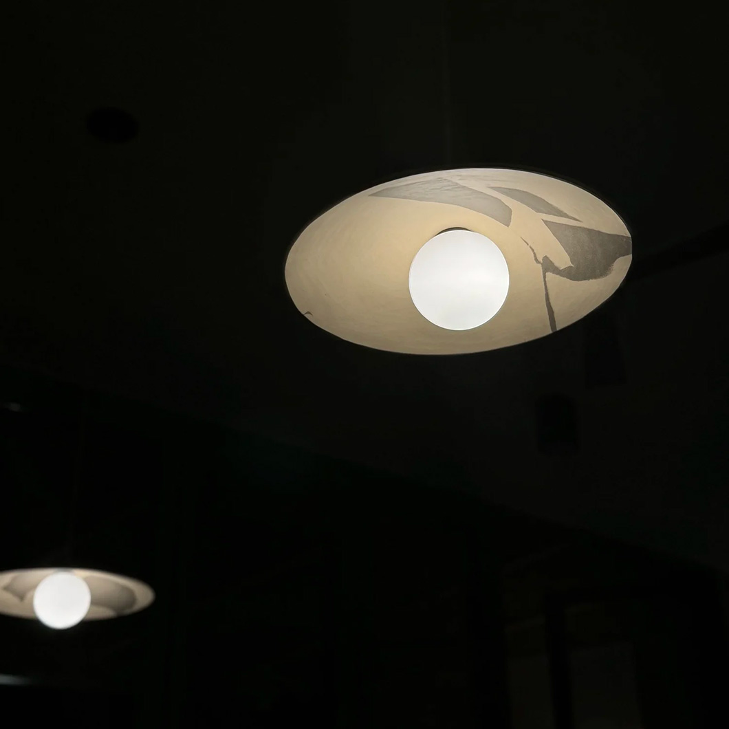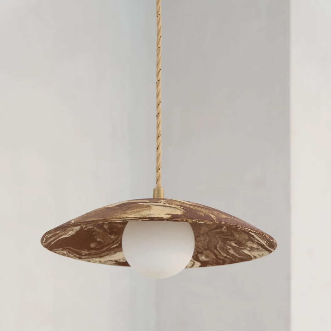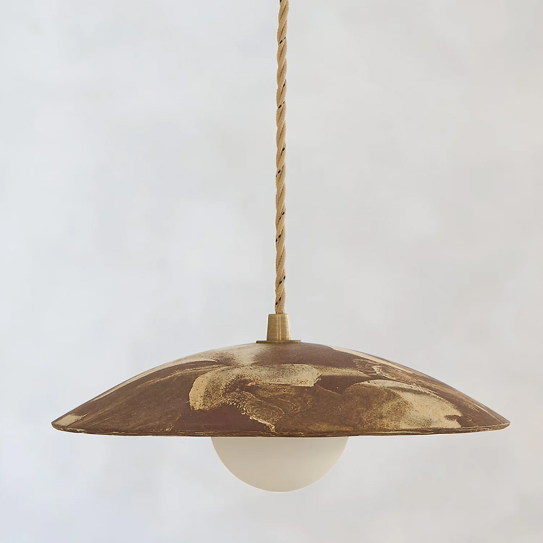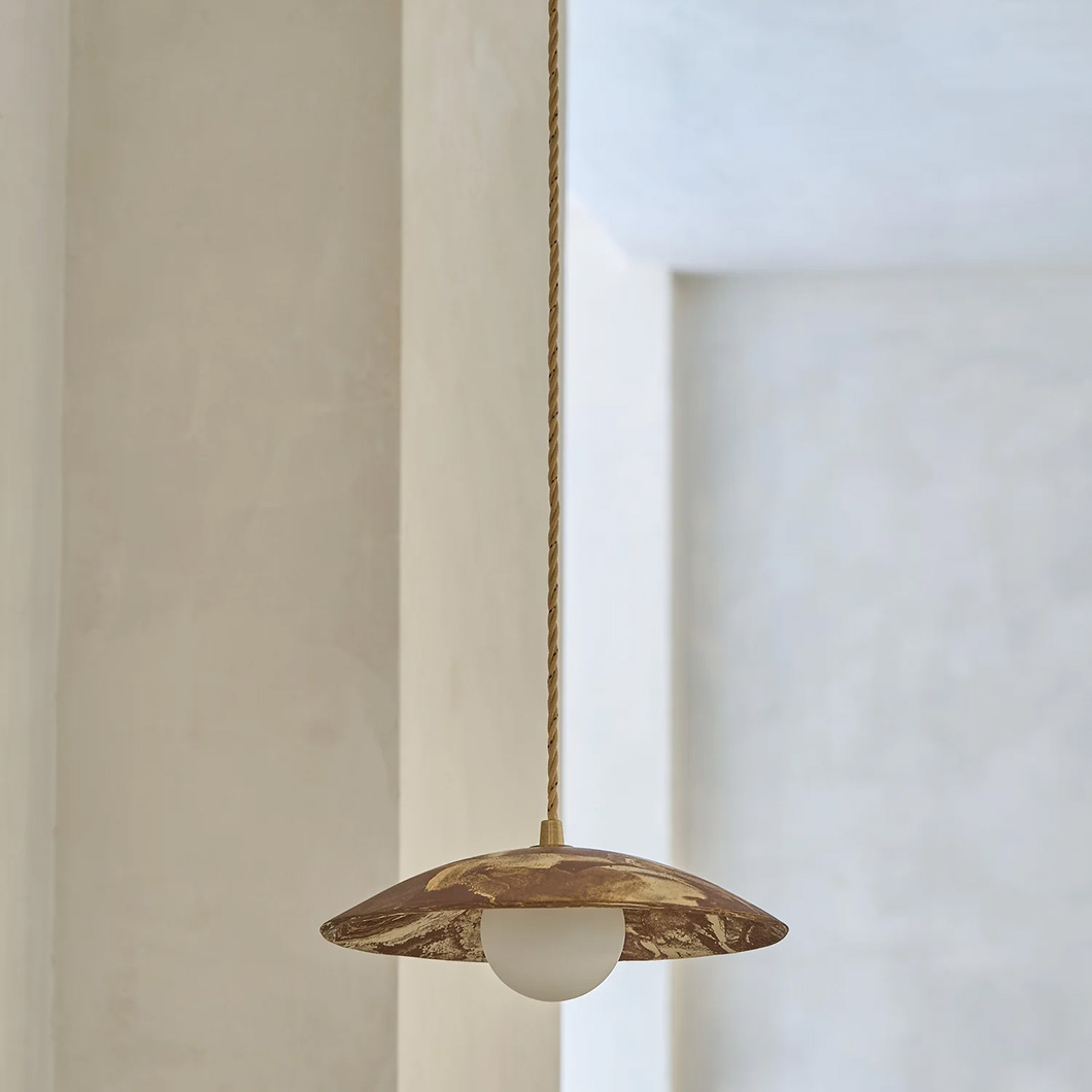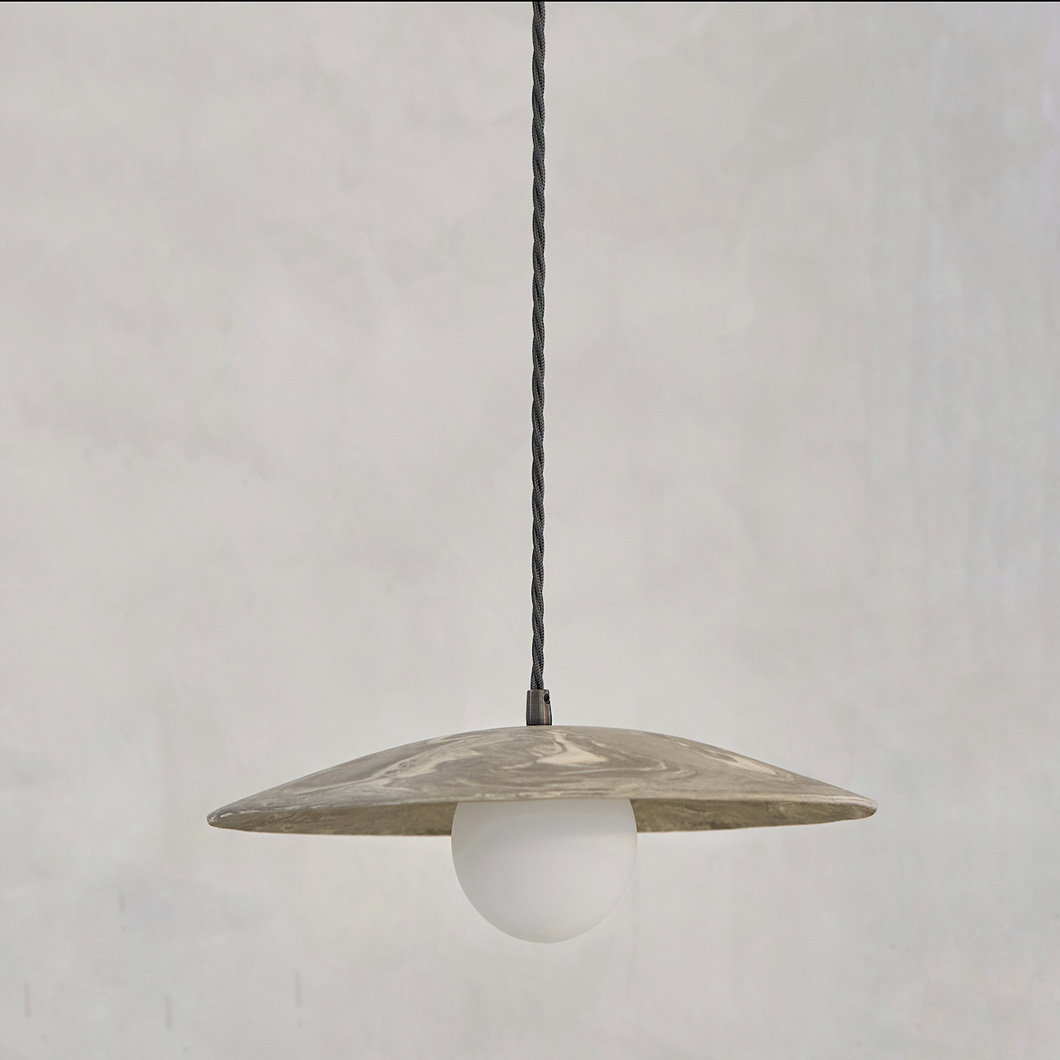 Choose between two diameters: Ø260mm or Ø360mm. The pendant's structure and ceiling rose are crafted from brass, available in 8 modern finishes: brushed brass, polished brass, brushed nickel, polished nickel, brushed aged brass, blackened brass, matt white, or matt black. The ceramic disc is available in 6 finishes: cream stratum, ocre stratum, red stratum, black stratum, cream and grey leather, and grey and cream leather. Finally, the suspension cable is available in natural linen, golden, slate grey, or banda black.