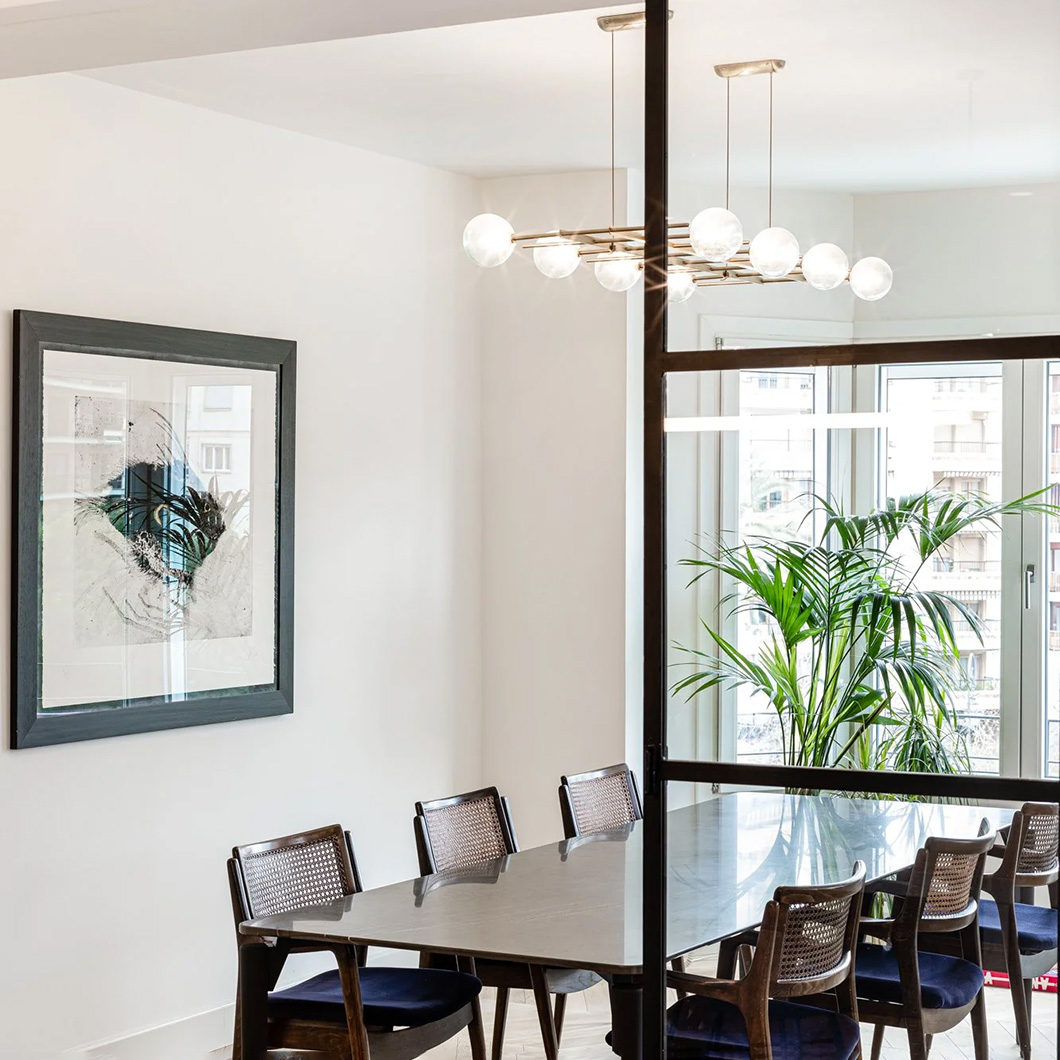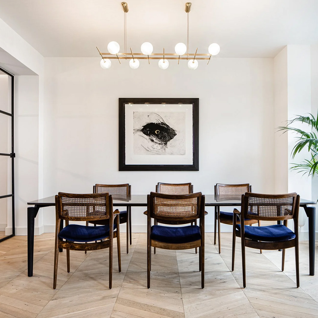 Whether highlighting a chic kitchen island or serving as a statement piece in a warm, welcoming lounge, the range of brass finishes will flawlessly integrate this lamp into your interior. Modular Flat 8 is available in brushed brass, brushed aged brass, blackened brass, polished brass, brushed nickel, polished nickel, matt white, or matt black. Available in a 1300mm width, this sleek suspension light may be more suited to larger, open areas. With a customisable drop height, the Modular Flat 8 is certain to fit a wide variety of spaces.