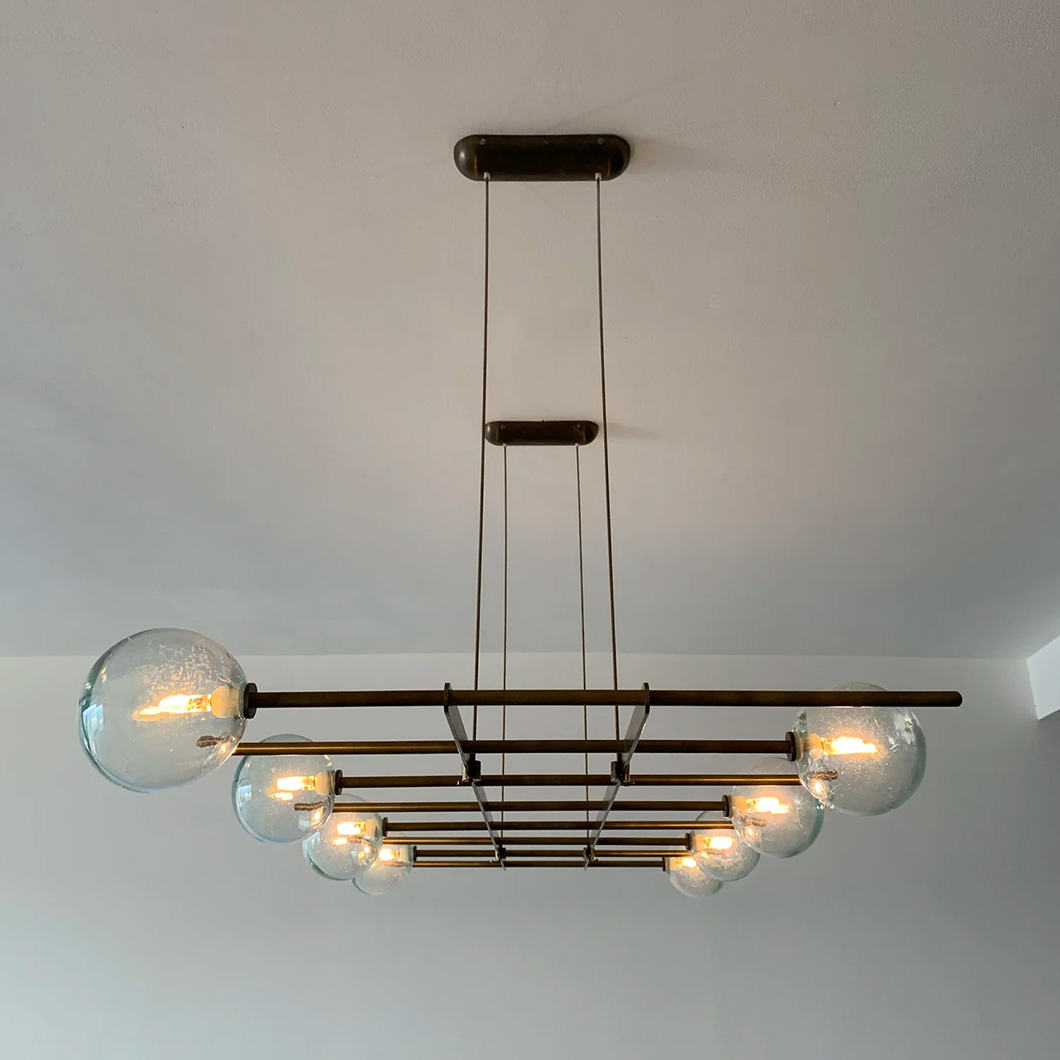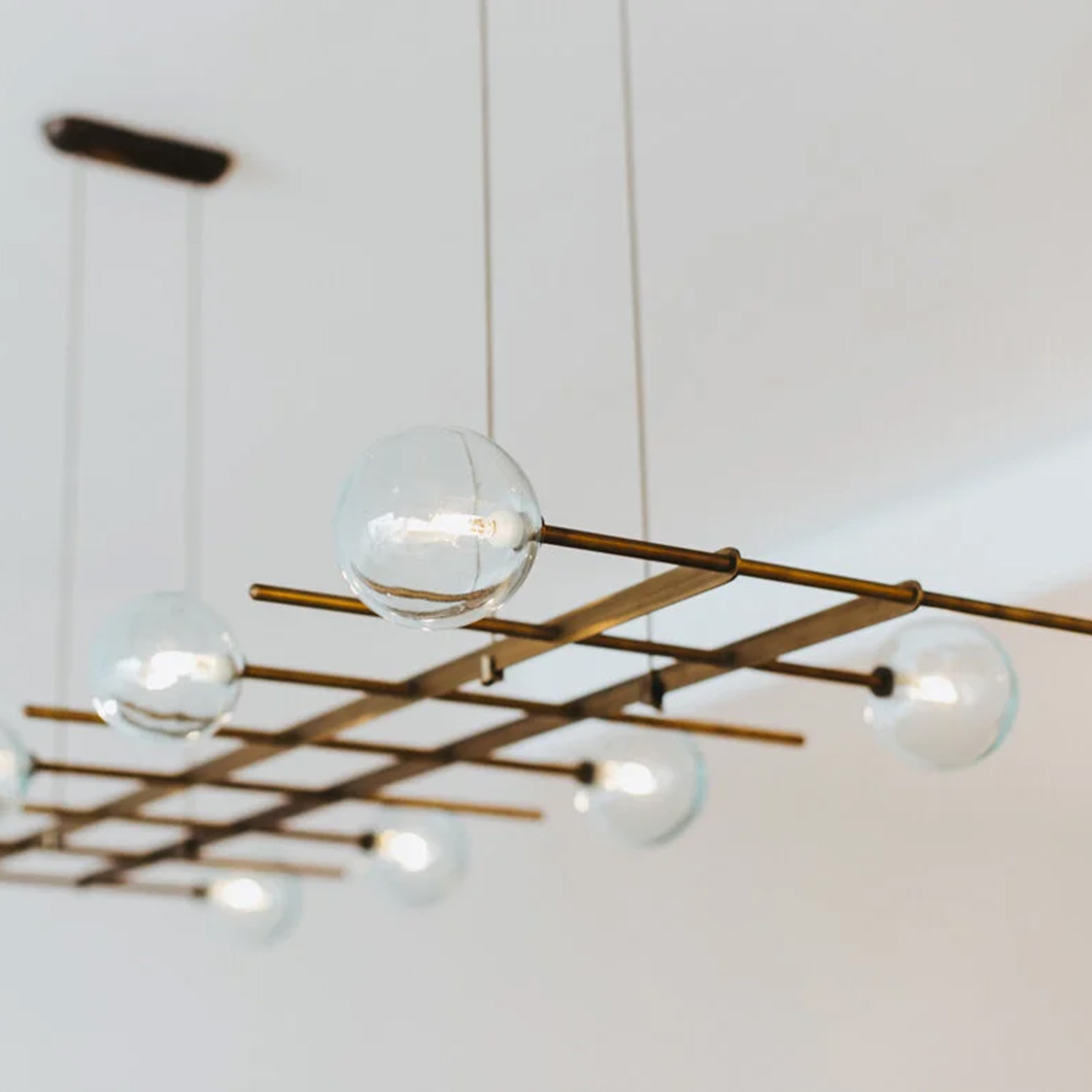 The stunning Modular Flat 8 Chandelier is a modern focal point. Crafted from brass, the linear suspension light delivers a strikingly modern look that complements simple, contemporary spaces. Modular Flat 8 features eight transparent glass globe diffusers attached to the brass structure. Available in a 1300mm width, this sleek suspension light may be more suited to larger, open areas.
