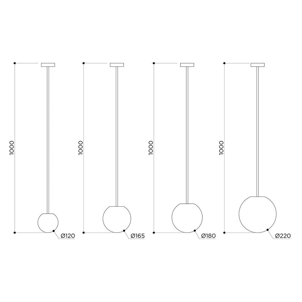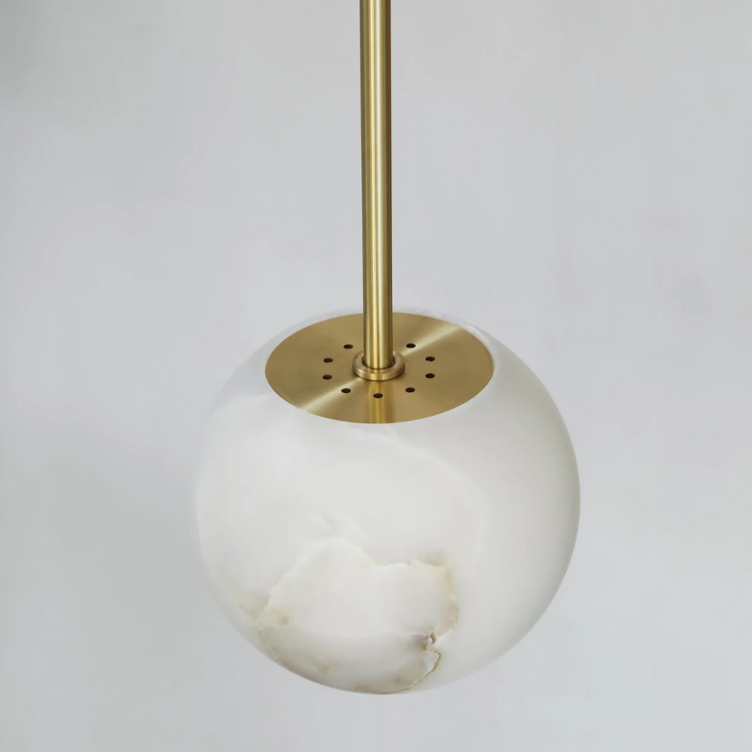 The alabaster globe is available in 4 different sizes: Ø120mm, Ø165mm, Ø180mm, and Ø220mm. Planette has a standard drop of 1000mm; however, this is also customisable on request. The brass frame is available in matt white, matt black, brushed brass, blackened brass, brushed nickel, polished nickel, polished brass, or brushed aged brass. Find more products in the Planette range, and similar alabaster fixtures in our 'More Like This' section below.