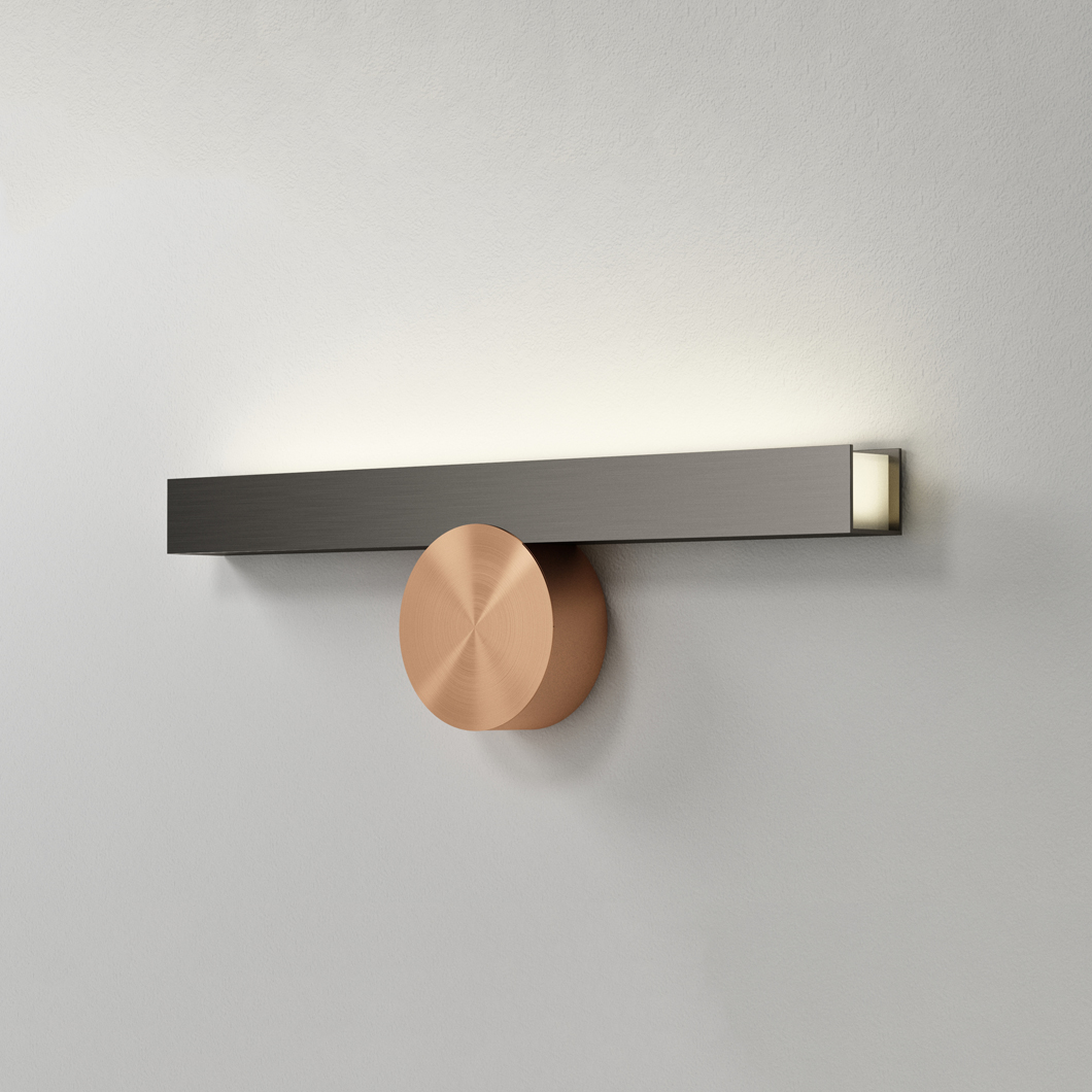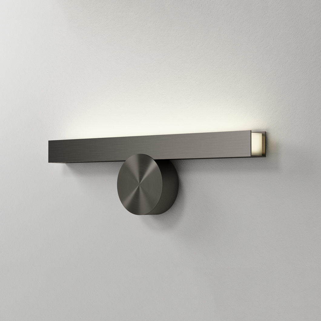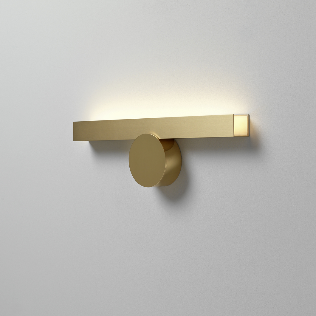 Cale(e) IP44 wall light is clear and refined in its sharp brass structure; complete with the distinctive graphite disc to accompany it. The IP collection are a series of wall lights designed for bathrooms. With their splash-proof exterior, these luminaires can be used in bathroom zones two and three. Cale(e) are a family of minimalist, geometric luminaires consisting of a black circular focal point, and an accompanying solid brass rectangular structure which varies in orientation with each version. This IP44 wall light is available in three similar shapes, which are mounted to the wall in different positions. VH is mounted from the side, whereas VV and VF are installed from the front profile. While VV is fixed in a sophisticated straight orientation, VF is at a downward-facing angle, illuminating a warm white LED glow upon the surrounding area below.